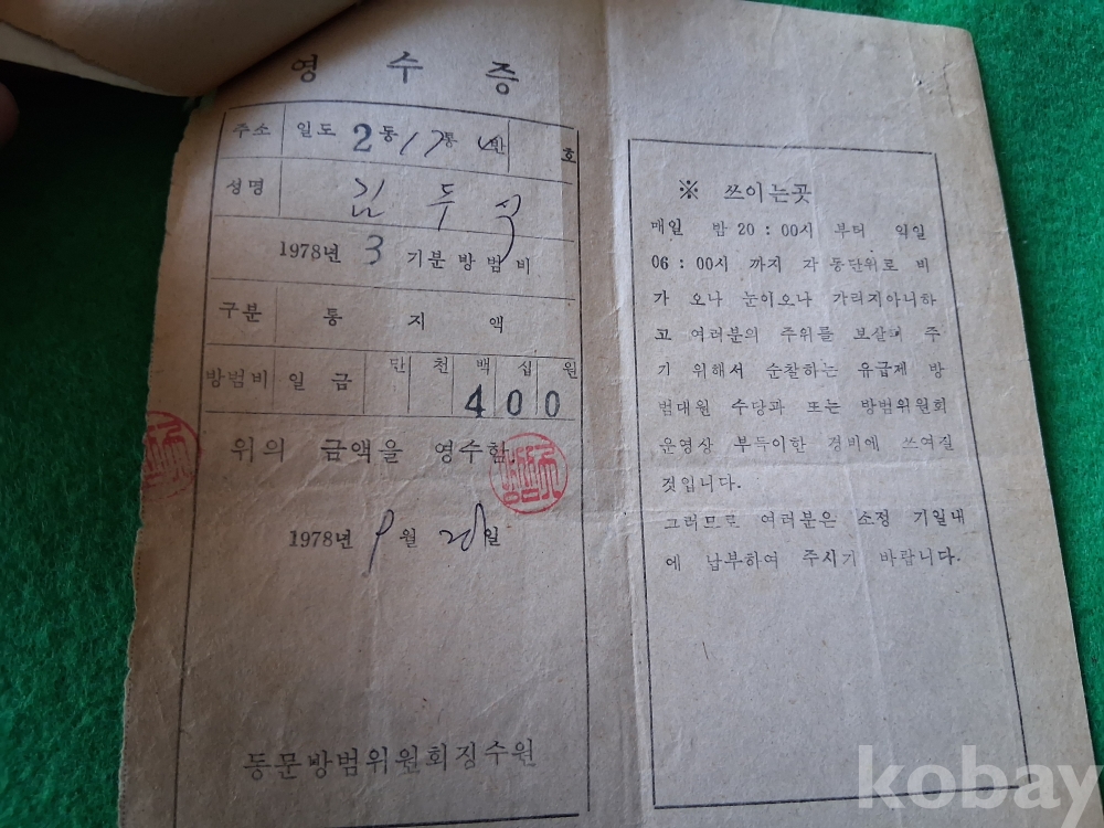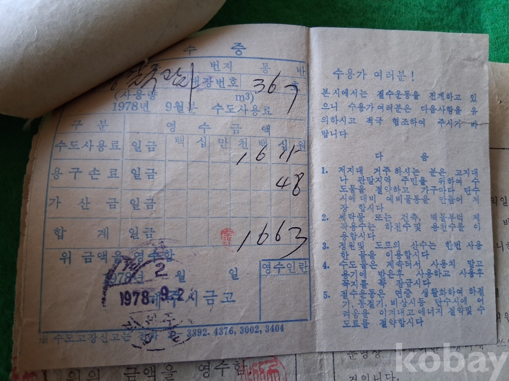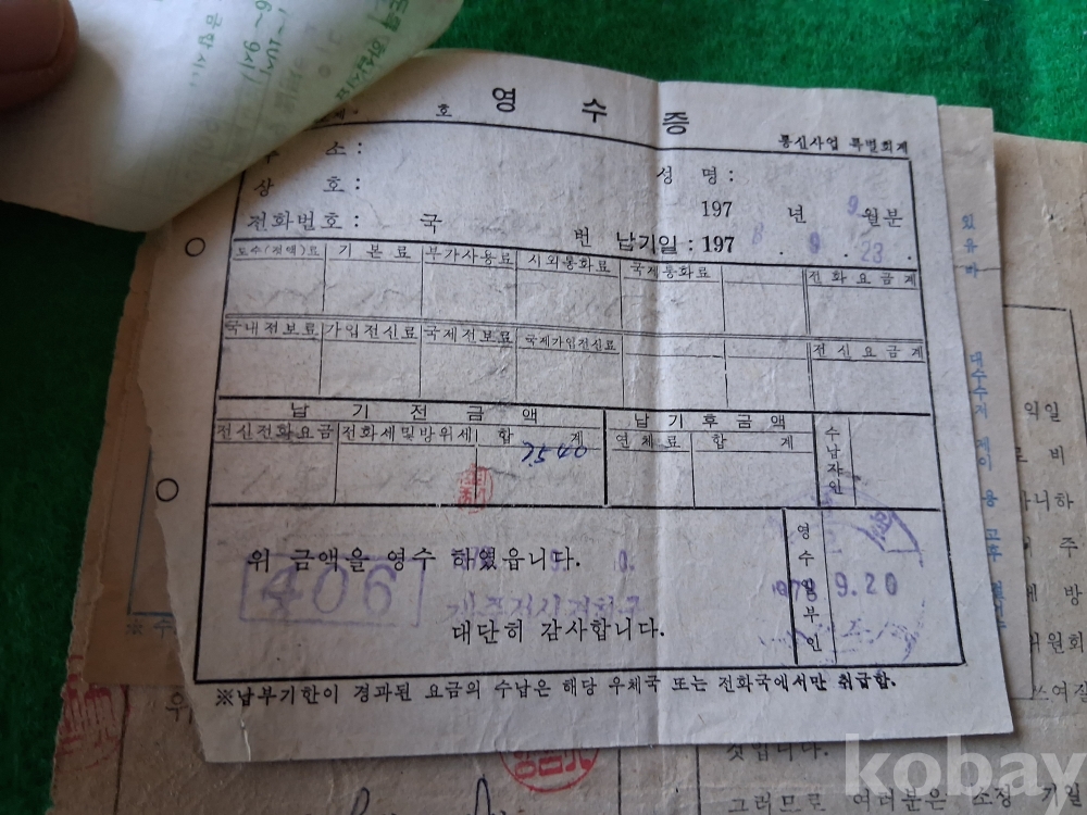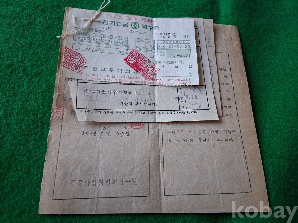 70년대 전기요금, 전화요금, 수도요금, 방범비 영수증 4매