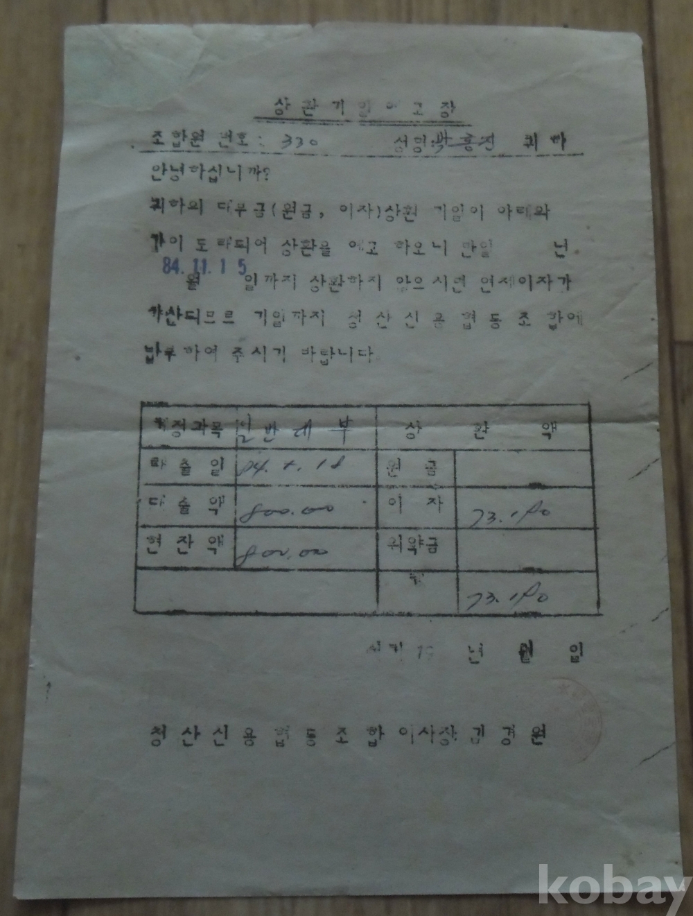 1984년 청산신용협동조합 발행 상환기일예고장