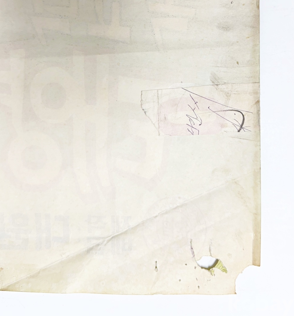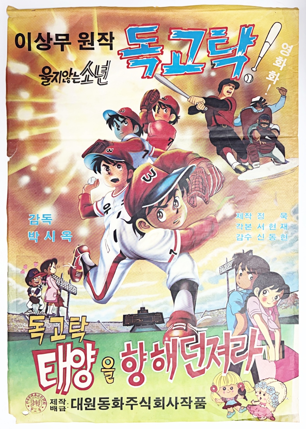상품 설명 | 이상무 화백의 인기 만화 '독고탁' 시리즈를 원작으로 한 극장판 애니메이션 '독고탁 태양을 향해 던져라' 포스터이다. 우측 옆면 하단 테이프 수리, 좌측 옆면 찢김 및 하단 모서리 유실, 뒷면 낙서 있음. | ||