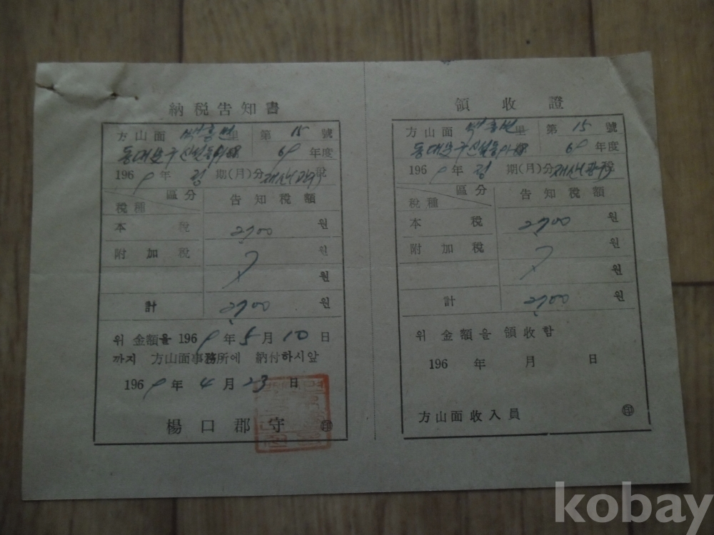 1969년 양구군수 발행 납세고지서(영수증)