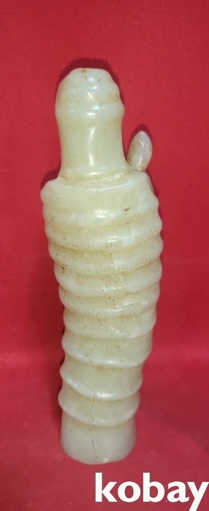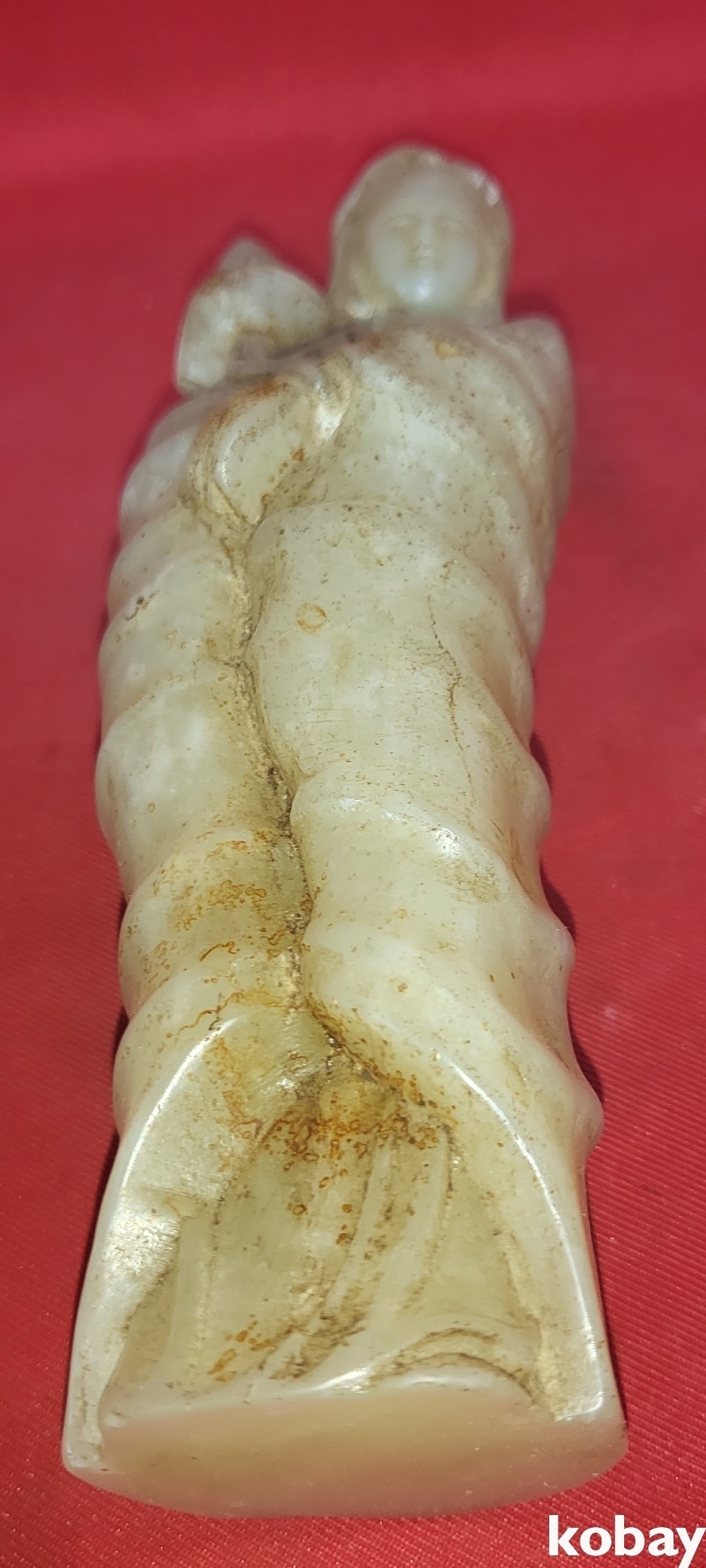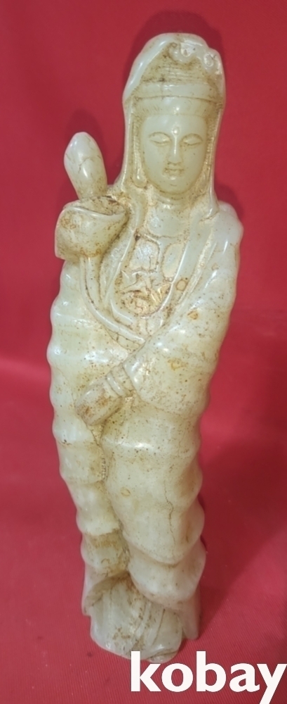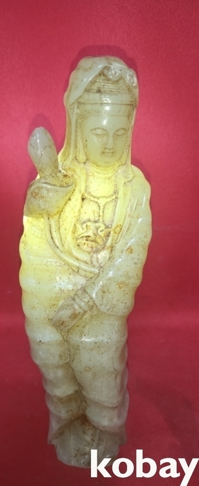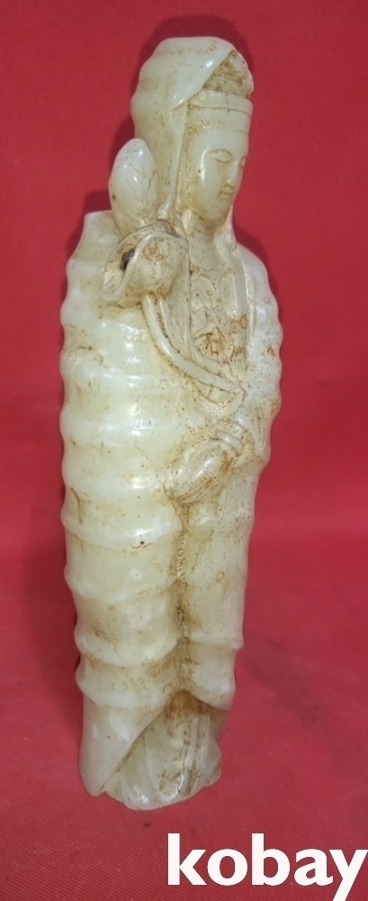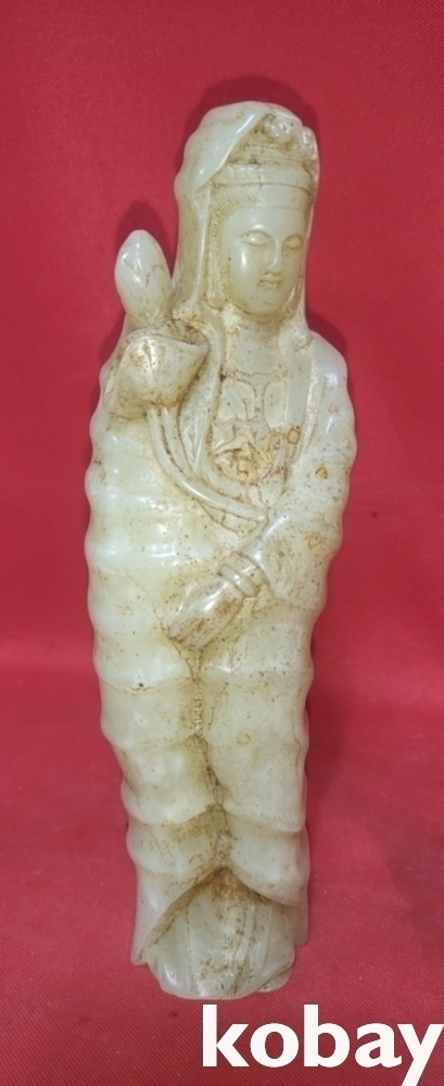 백옥(白玉)으로 완성된 전신을 연잎으로 감싸고 연꽃 봉우리를 들고있는 입불상(立佛狀)입니다, 오래된 기물로 광채가 없는 것이 특징입니다,