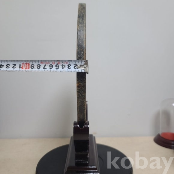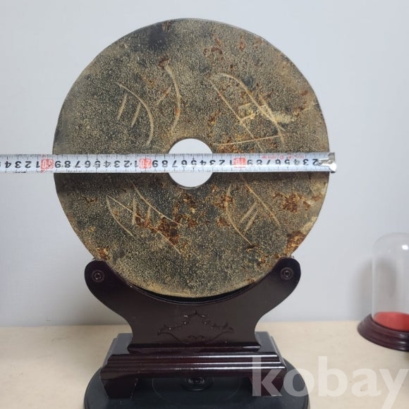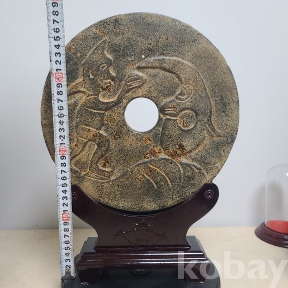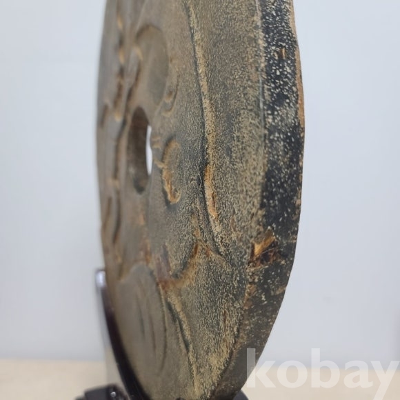 양각으로 다양한 홍산문화 조각이 담긴 옥패입니다 자석에 반응하는 재질에 전용 나무좌대를제작하여 감상하시기에 좋습니다