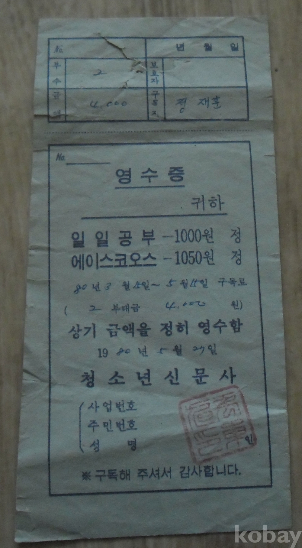 1980년 청소년신문사 일일공부 대금 영수증