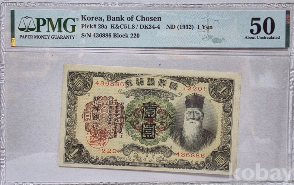 -대한민국 조선은행권 개 1원 유번호 PCGS 50 등급 입니다.