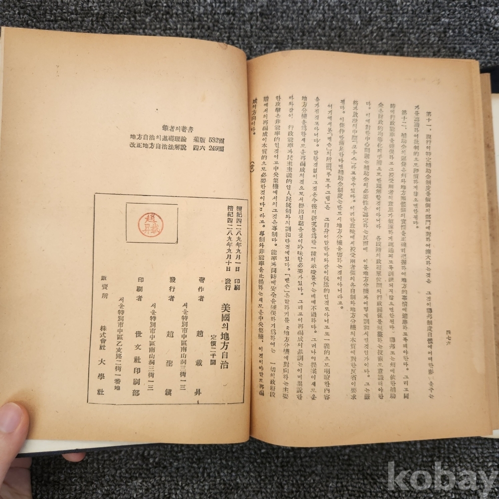[희귀본, 미국사, 지방자치] 조재승, <미국의 지방자치>, 세문사, 1956(초판), p. 476, 상태 중급(사진참조)