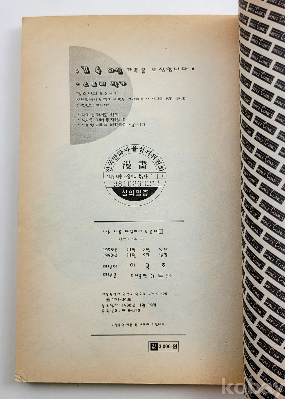 물 품 명 | 김숙 / 나는 너를 바람이라 부른다 (1~11)완결 총11권 / 1998~1999년 초판 / 도서출판 아트맨 |