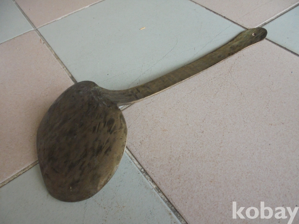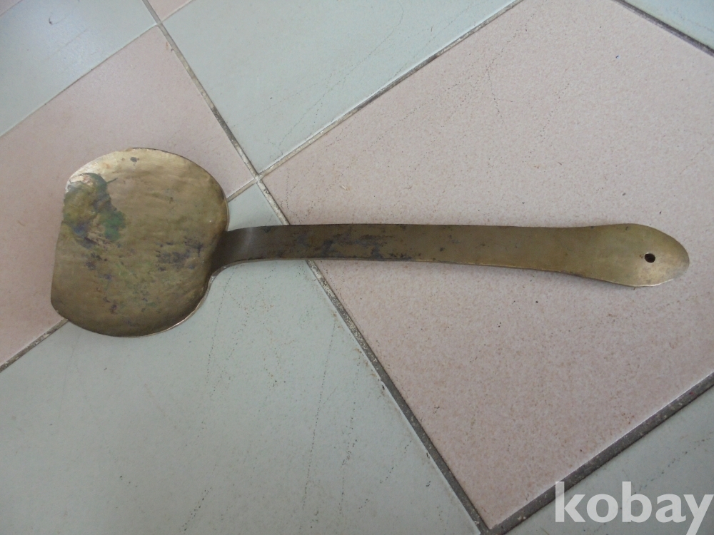 방짜로 만들어 때린자국이 보이고 오래사용하여 끝이많이닳고 커서 큰일할때만 사용한 귀한 유기놋쇠 대형주걱