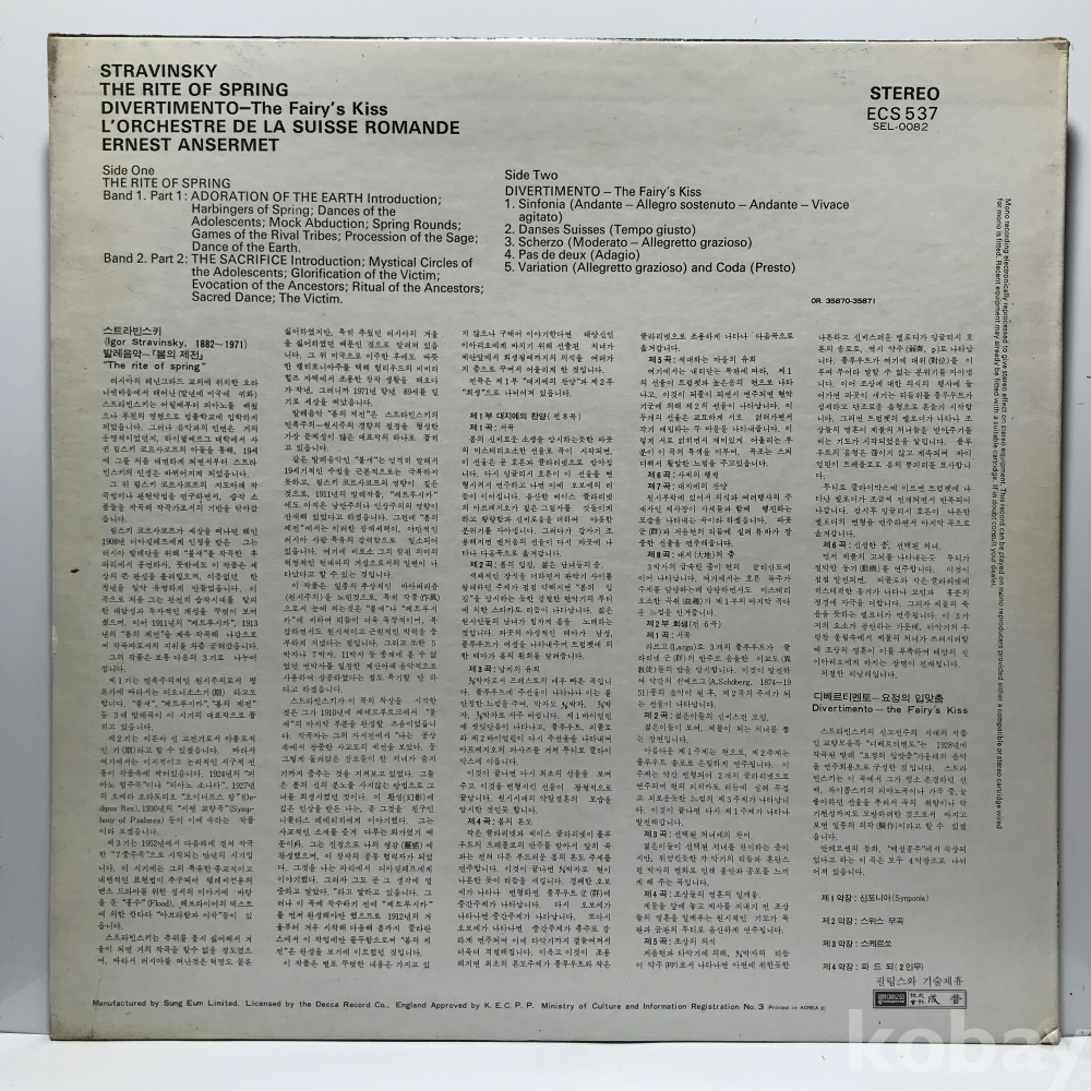 LP 10,720-38 STRAVINSKY - THE RITE OF SPRING / DIVERTIMENTO . 자켓 EX+ 알판 EX+ 72 년 국내반
