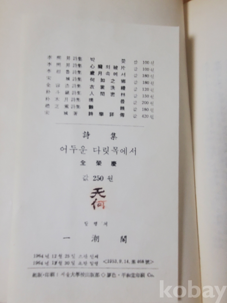 1. 어두운 다릿목에서, 전영경, 일조각, 1964년, 181쪽, 상태 상, 사진 참조