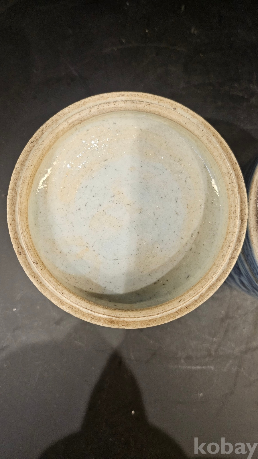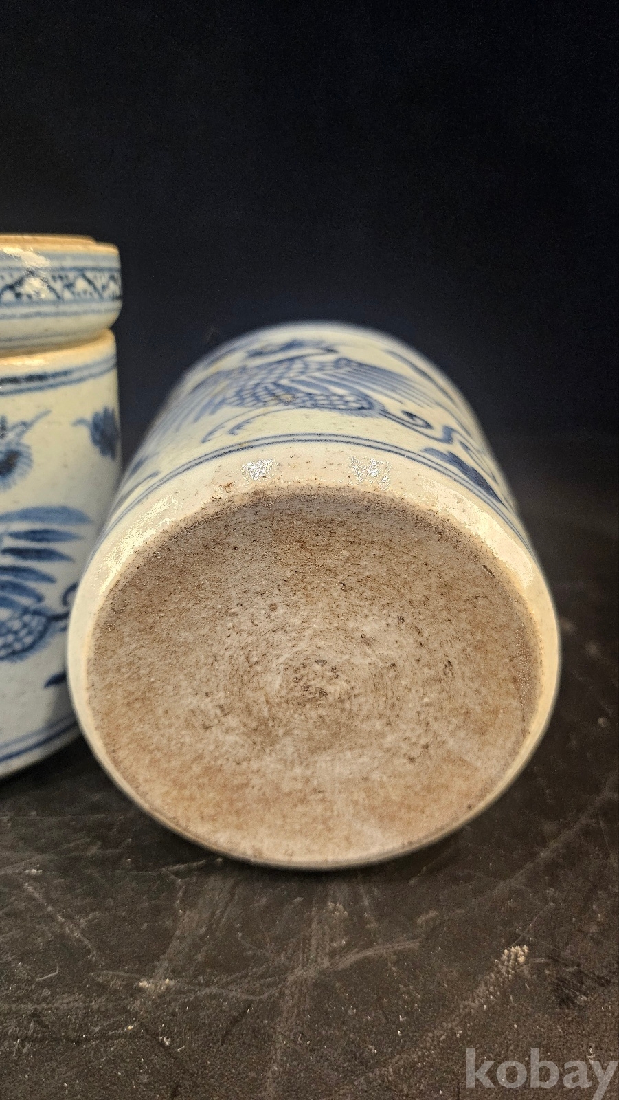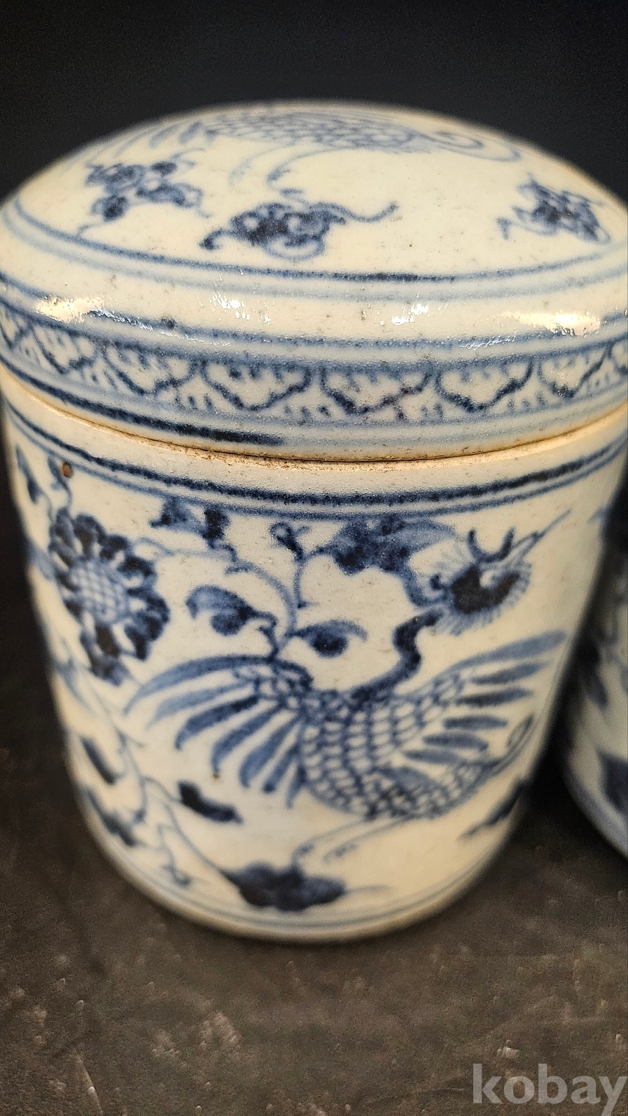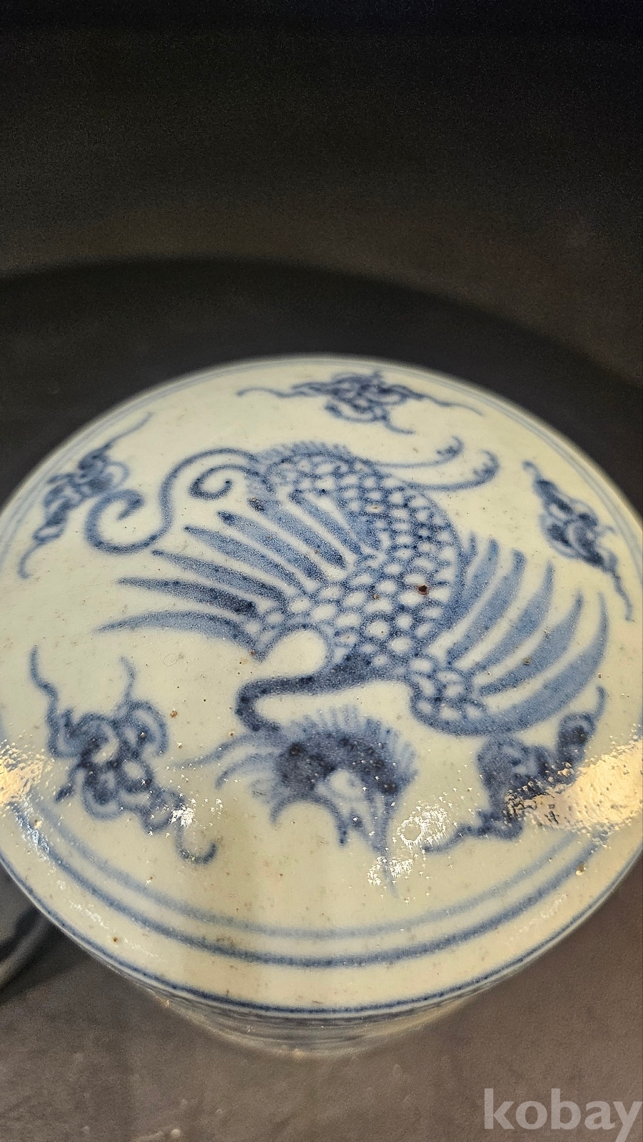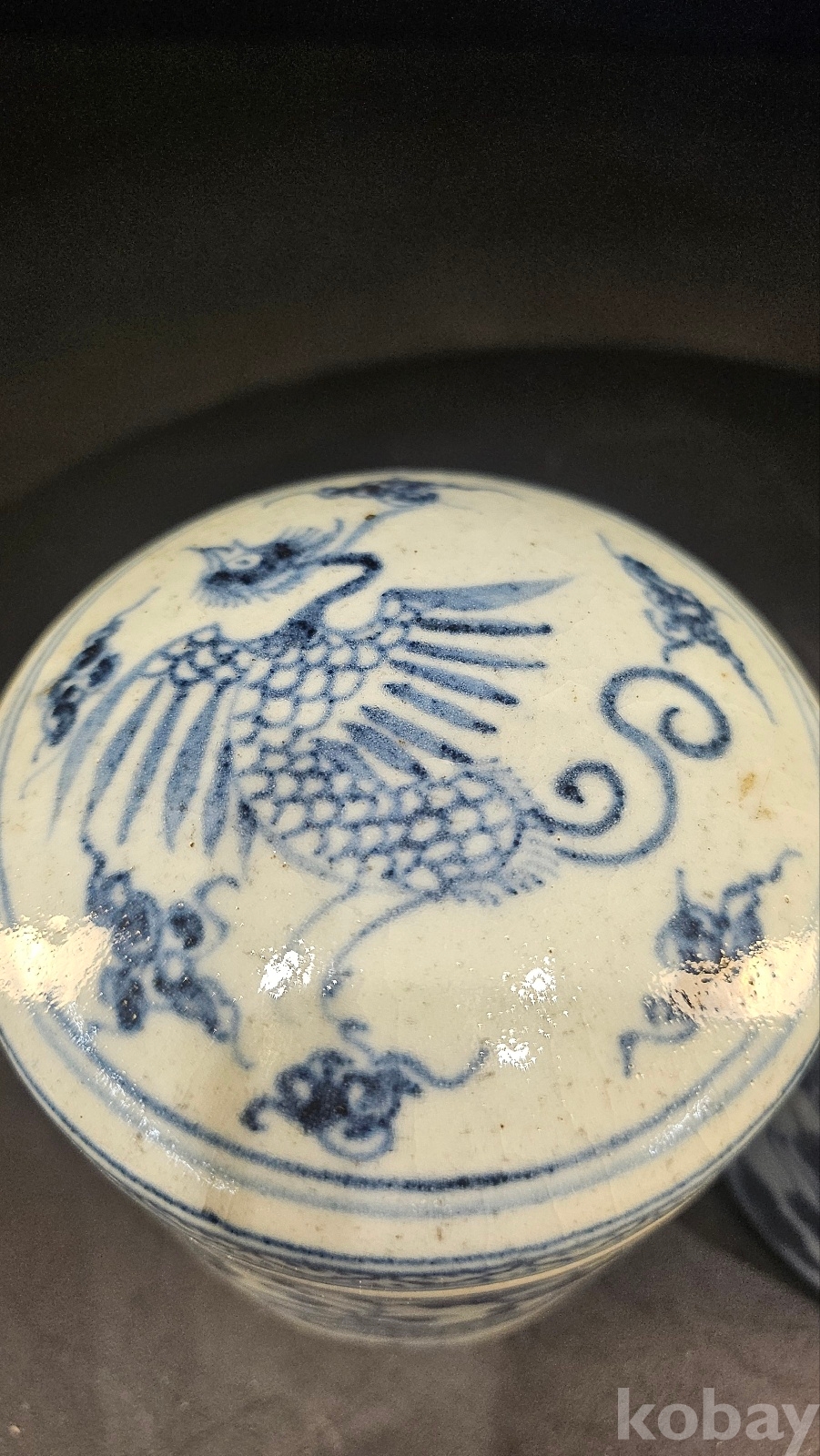 높이 12 황실용 차나 약보관용 기물이다 봉황은 황비나 귀비가 사용한 도안이다 유약색을 보면 명말~청초의 색감이다 청화는 회청이면서 번짐도 있다 굽은 얕고 태도가 거칠다(명말~강희년간 형태) 내부에는 유약 흐름과 자연오염이 존재하는 실사용 기물이다