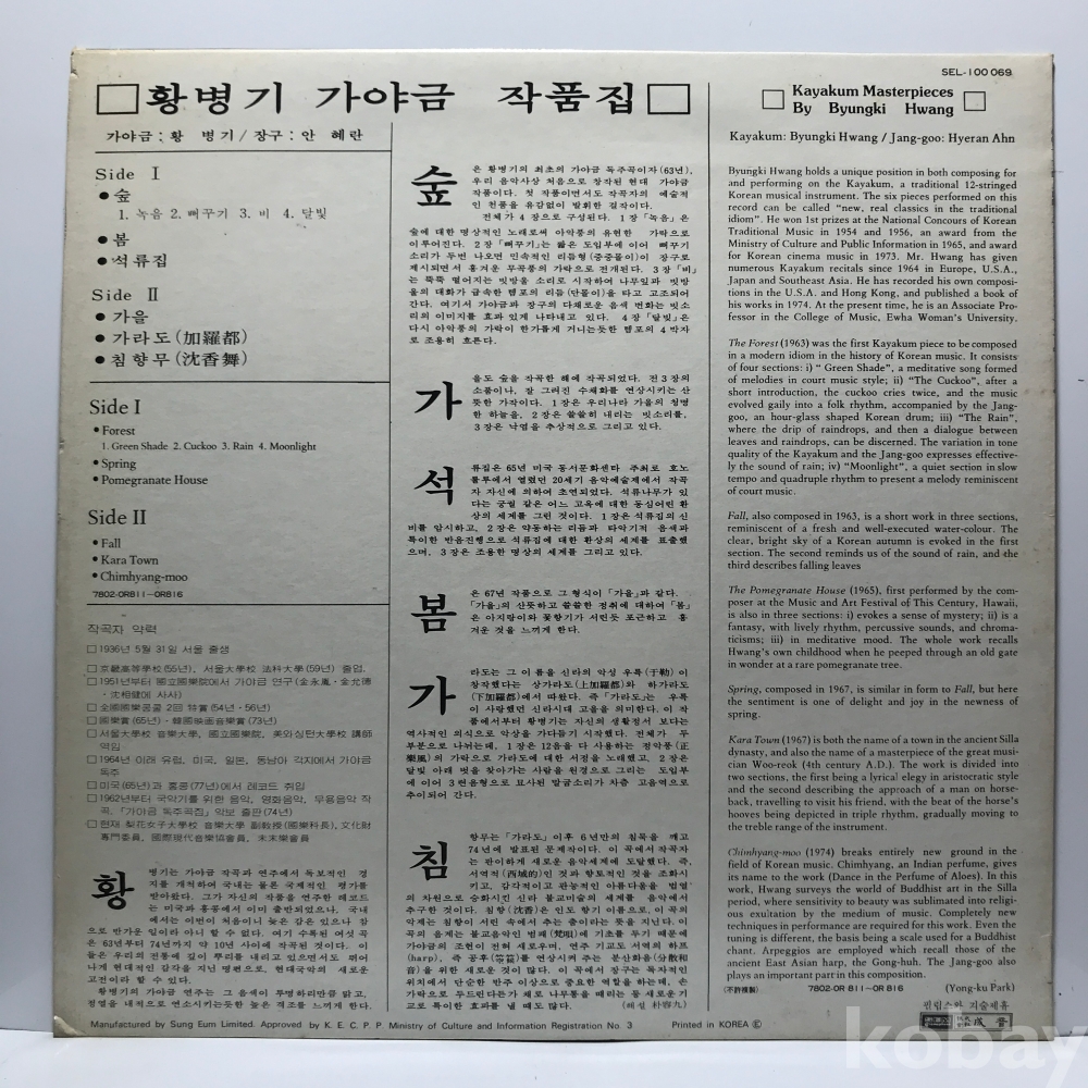 LP 85,000-14 황병기 가야금 작품집 . 자켓 EX+ 알판 EX 78 년 국내반