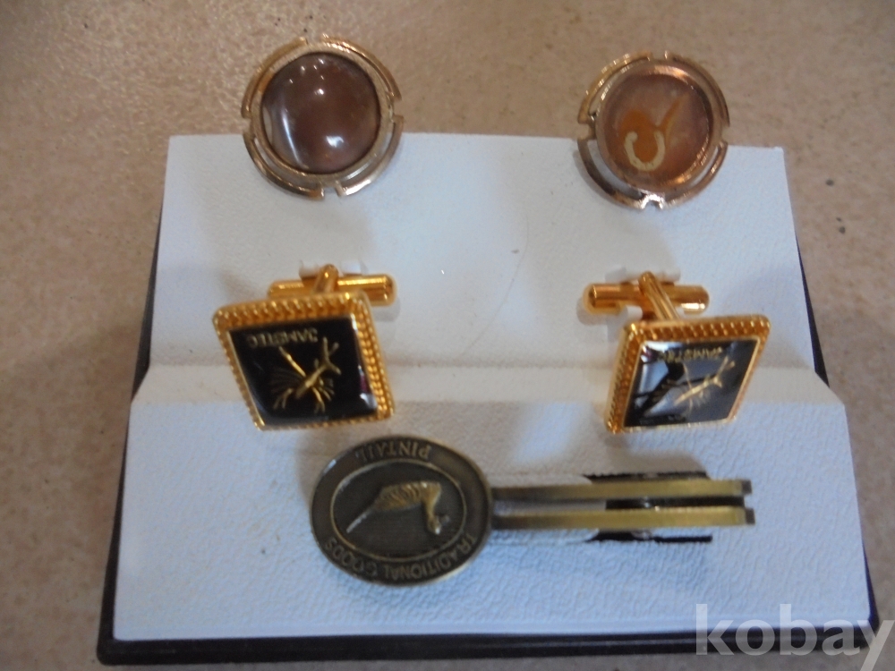 오래된것으로 옛날 금18케이 같은 와이샤스 소매단추대신 끼워 미사용한 1쌍과 사용한단추1쌍과 오래된 오리무늬있는 넥타이핀 1점