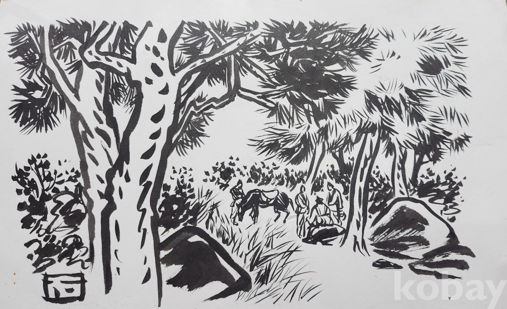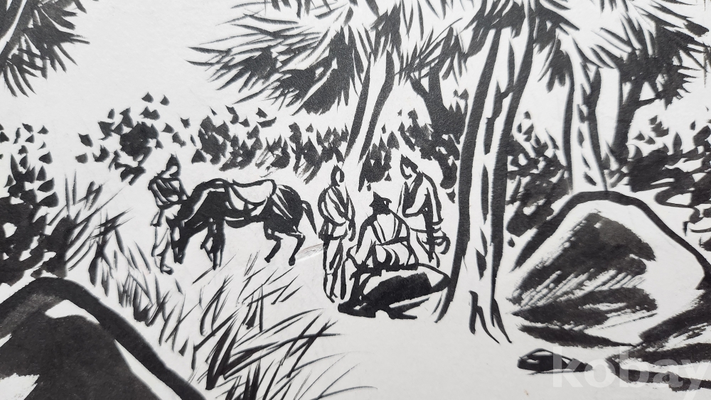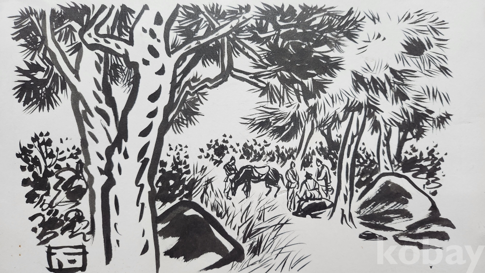 물과 먹으로 만 직접 그려진 수묵화 삽화입니다,