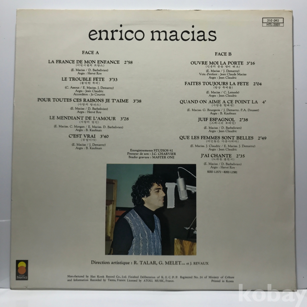LP 86,000-63 ENRICO MACIAS - ENRICO MACIAS 자켓 EX+ 알판 EX+ 82 년 국내반