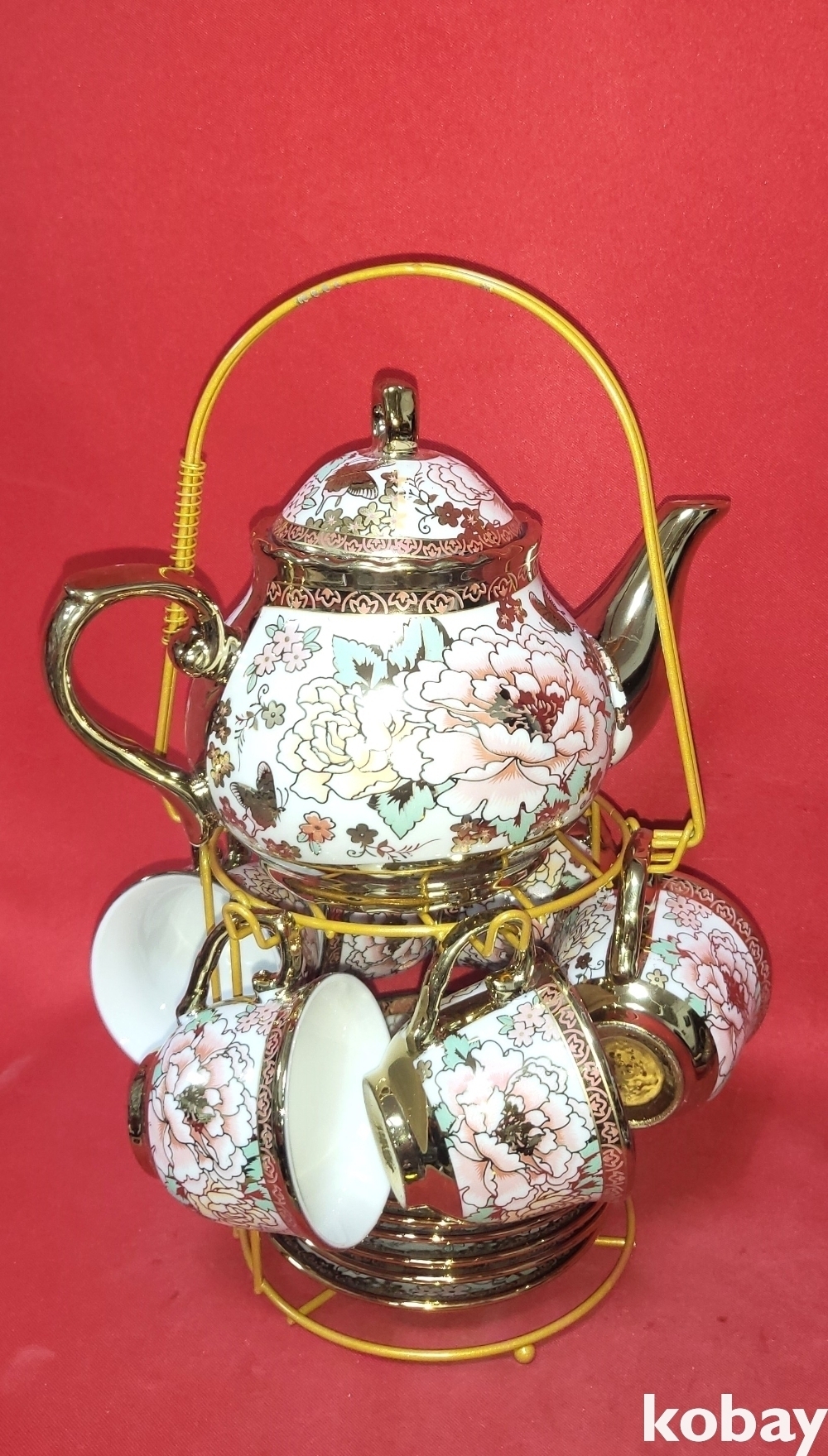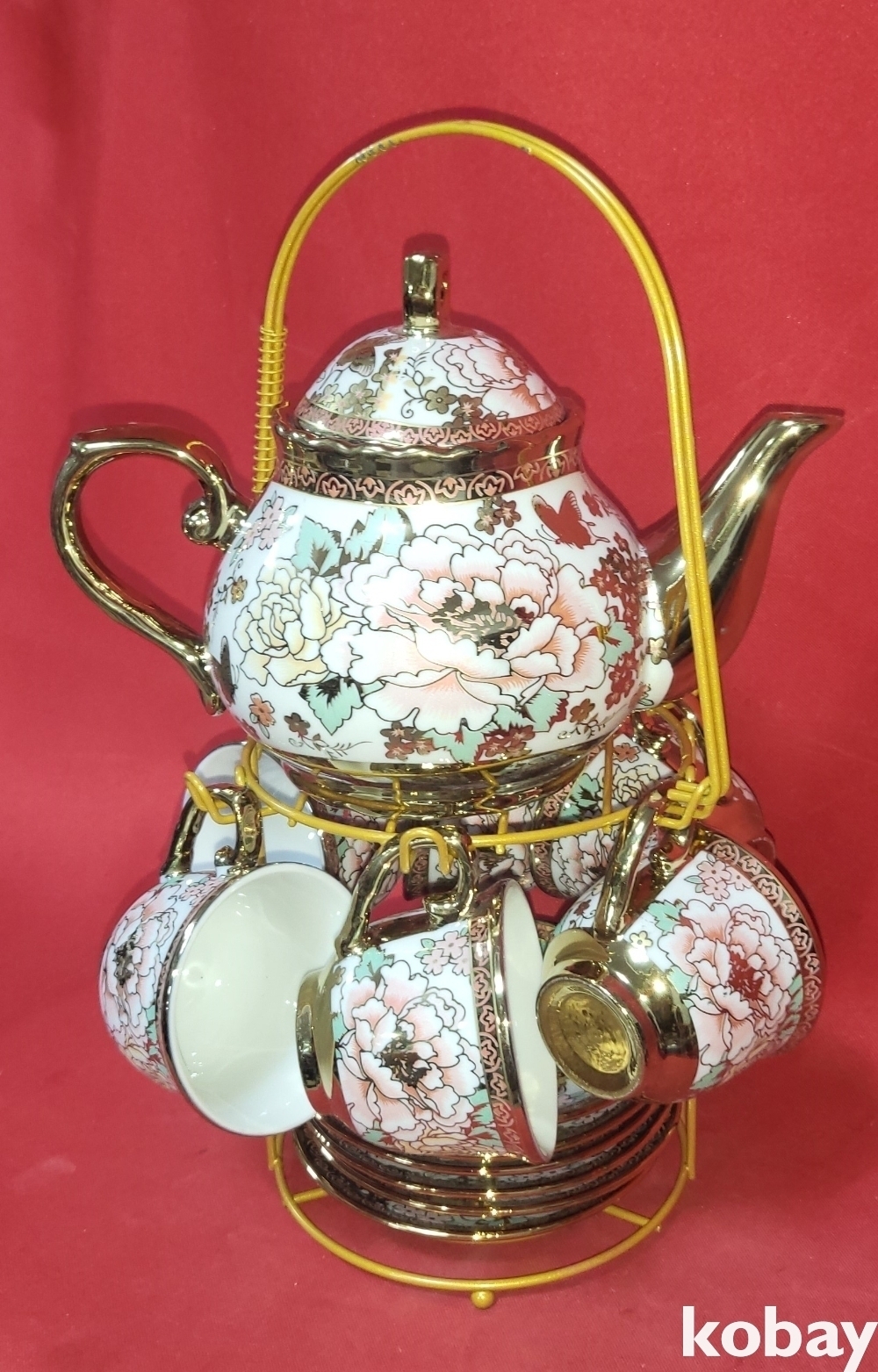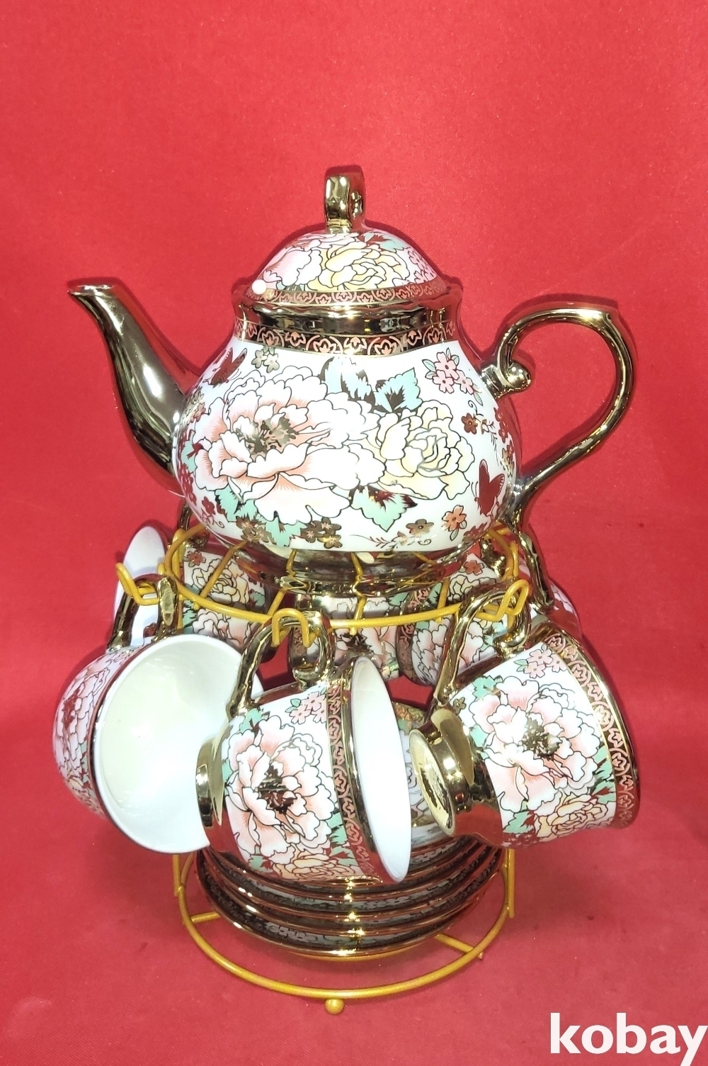 화려한 색감 목단 꽃과 나비 문양 6인용 다기셑트입니다,