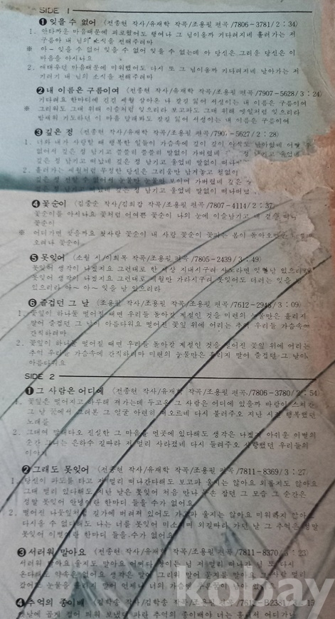 | 자켓상태 | VG : 주름, 접힘, 모서리 찢김 다수 | 음반상태 | EX : 재생에 영향 없는 가벼운 기스 존재 | 발매정보 | 알수없음 | 가사지여부 | 무 |