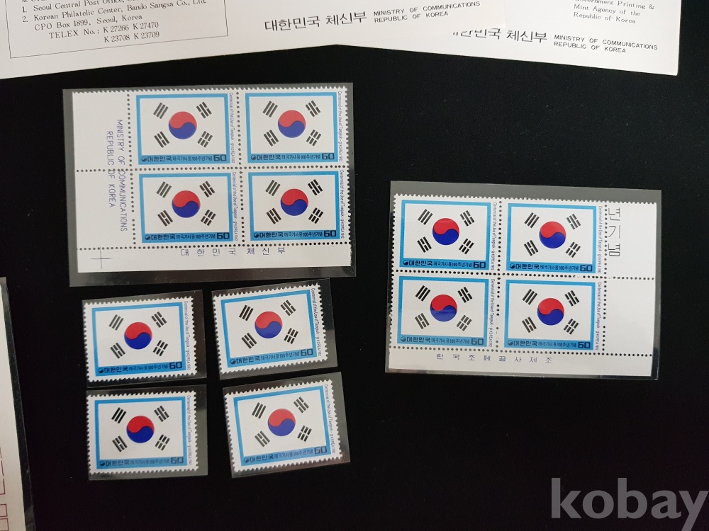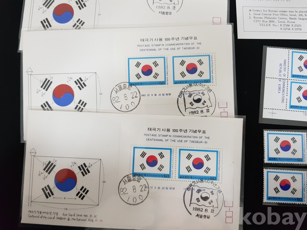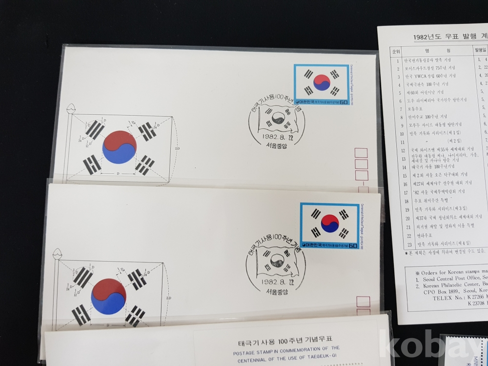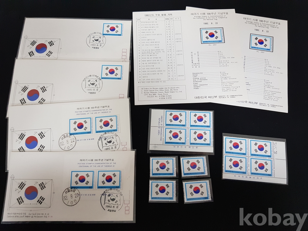- 1982년 태극기사용 100주년 기념 안내카드, 초일봉피, 명판 등 모음
