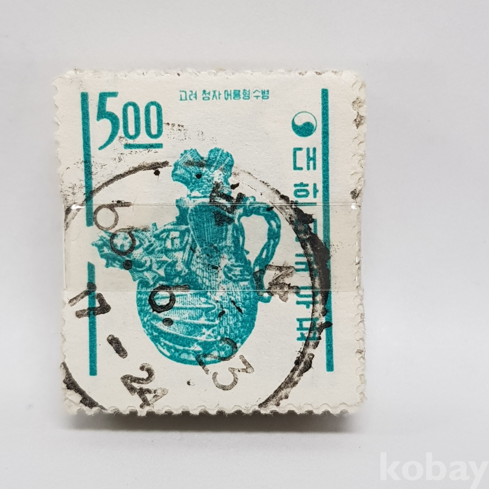 - 1960년대 신원화 보통 5원 청자어룡수병 일부인 미확인 사용제 우표 약 100매 묶음