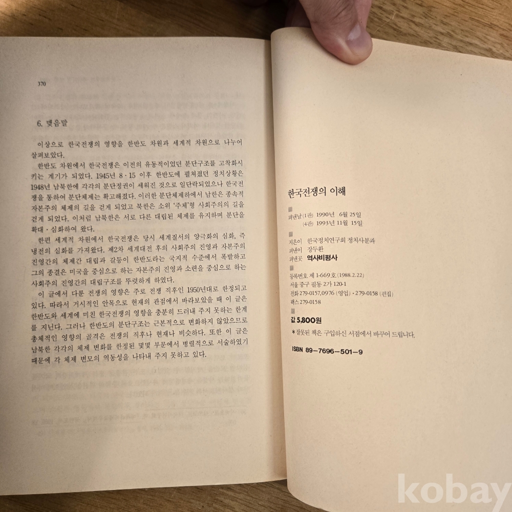 [한국현대사, 6.25전쟁] 한국정치연구회 정치사분과, <한국전쟁의 이해>, 역사비평사, 1993년, p. 370, 상태 중급(필기있음, 사진참조)