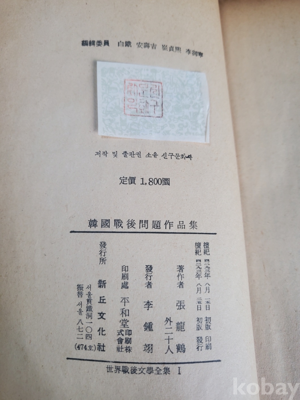세계전후문학전집 1 - 한국전후문제작품집, 1960년 초판, 437쪽, 상태 중,