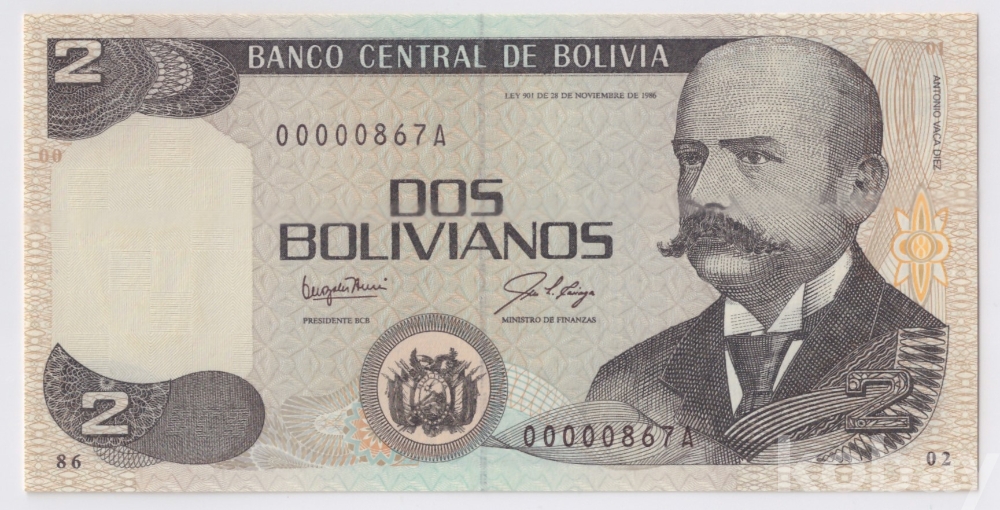 액면 : 2 볼리비아노 발행 : 1986년 상태 : 미사용 비고 : P-202a, 00000867A