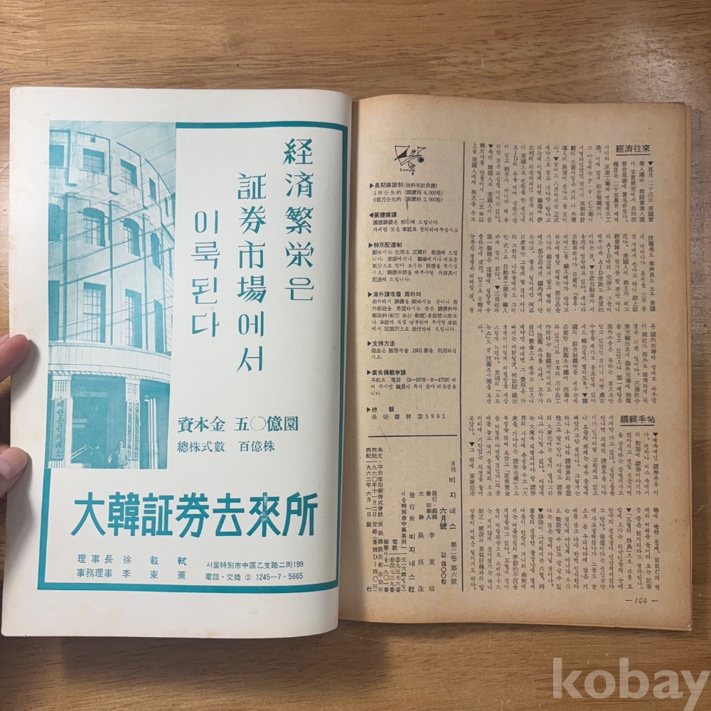[희귀본, 잡지, 한국현대사, 제3공화국, 증권시장, 자동차공업] <월간 비지네스 1962년 6월>, p. 104, 상태 중상급(사진참조)