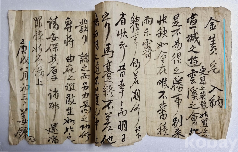 ◈ 경술년 8월 초23일에 강련(姜鍊)이 김 생원 댁에 보낸 간찰.
