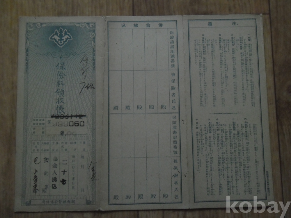 소화18년 조선총독부체신국 발행 보험료영수장