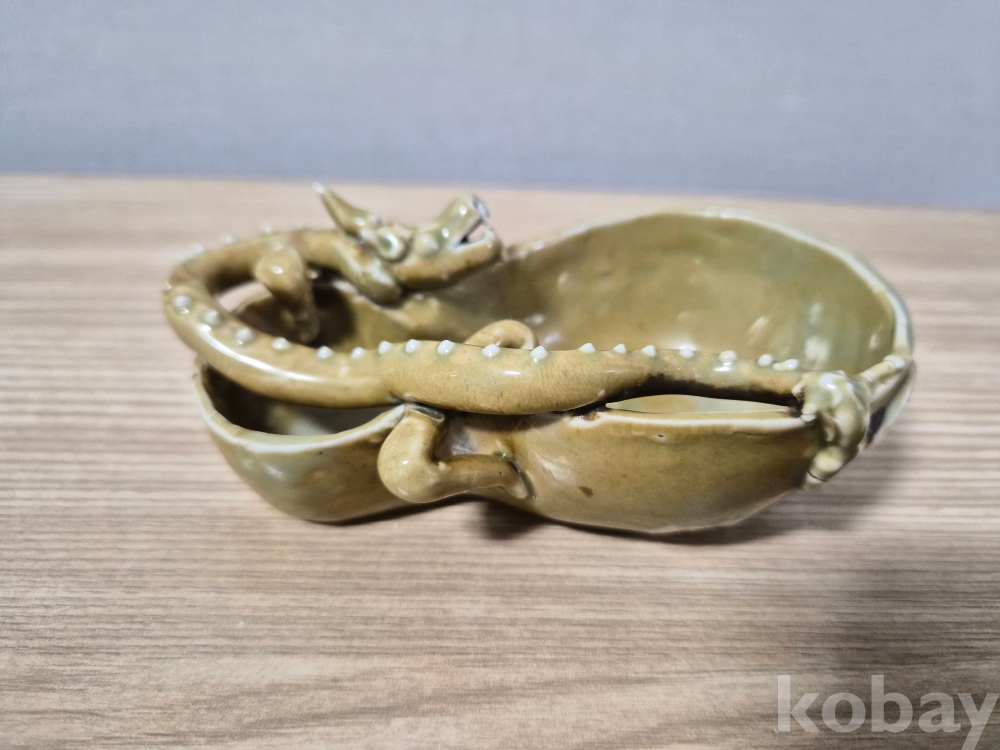 황청자 계열의 용표주박 특이한형태 표주박입니다. 용두에서꼬리까지 뚜렸하게 표현하였고 뿔하나가 뿌러졌습니다.(사진참조)