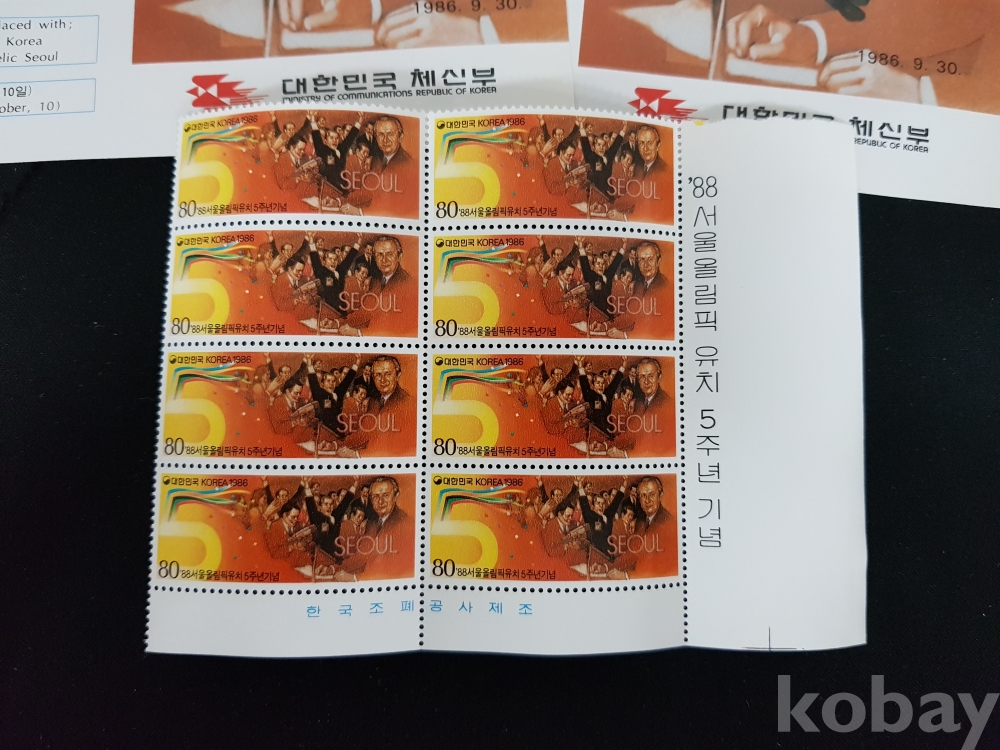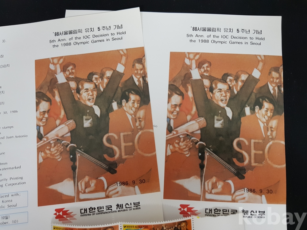 - 1986년 88서울올림픽 유치 5주년 안내카드, 초일봉피, 명판 등 모음