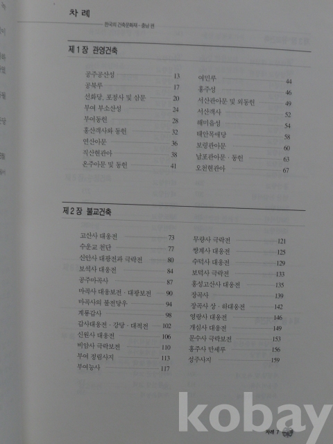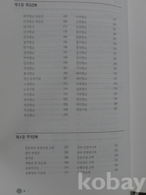 관영건축, 불교건축, 유교건축, 주거건축, 누정건축으로 나눠