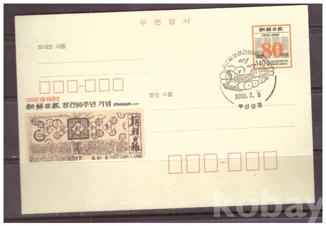 (기념엽서) 2000.3.4 CPC102 조선일보 창간80주년 (140원) (기념일부인)