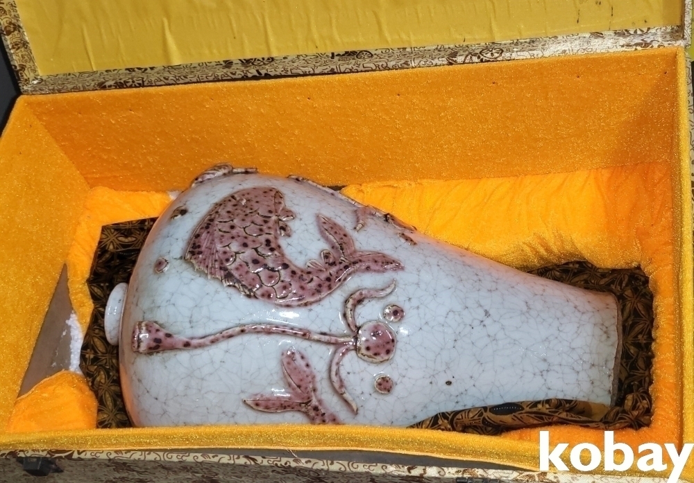 물고기 4마리가 연꽃과 함께 어우러진 도안이 양각으로 시문된 천하 명품입니다