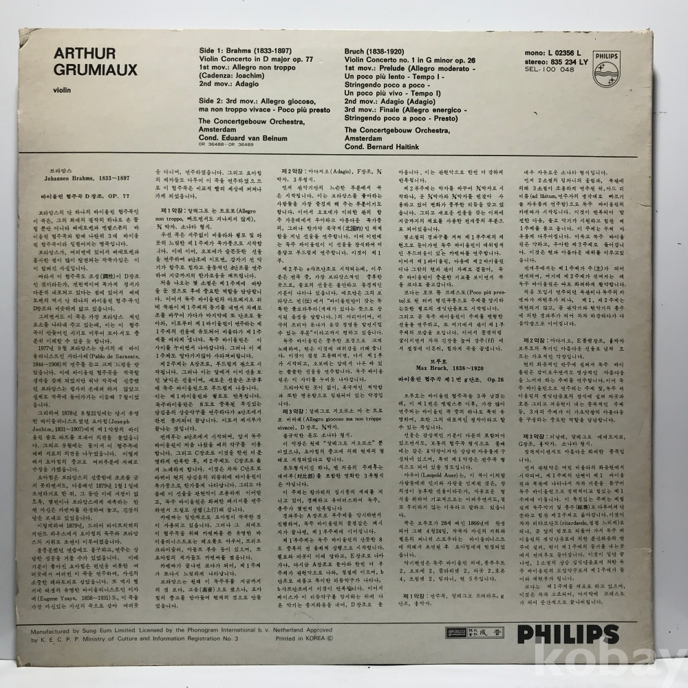 LP 85,000-77 Arthur Grumiaux - BRAHMS / BRUCH: Violin Concertos . 자켓 EX 알판 EX 73 년 국내반