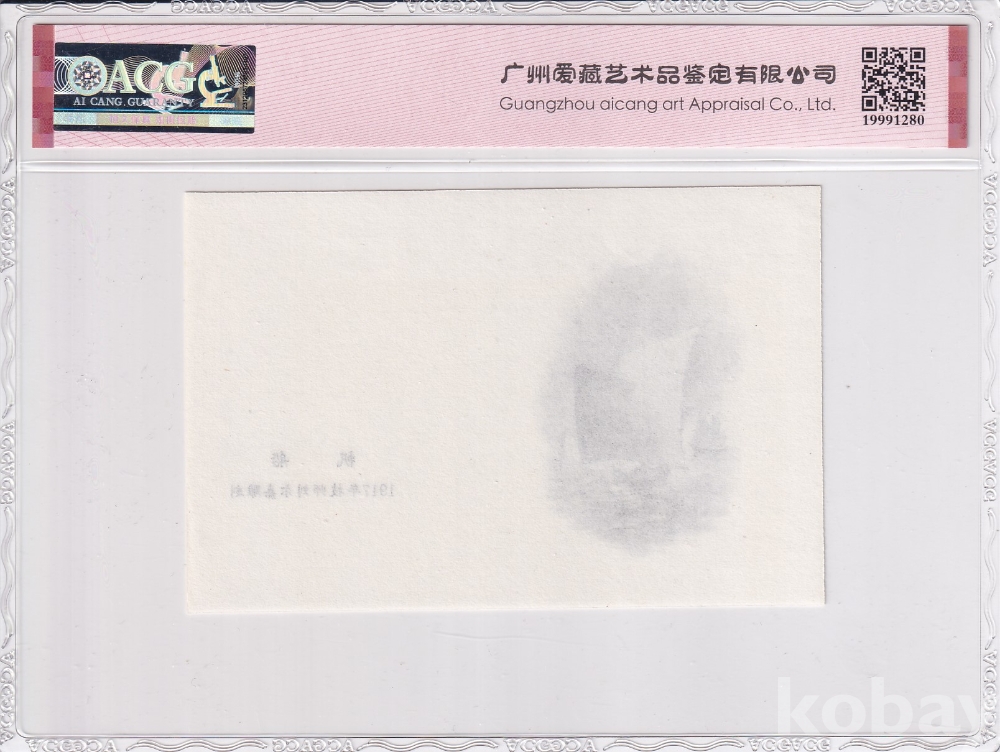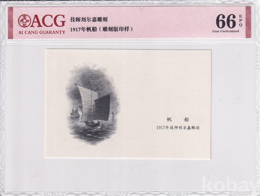 - 1917년 중국 리우 얼자(刘尔嘉) '범선' 요판 인쇄 견본 ACG 66 EPQ 인증