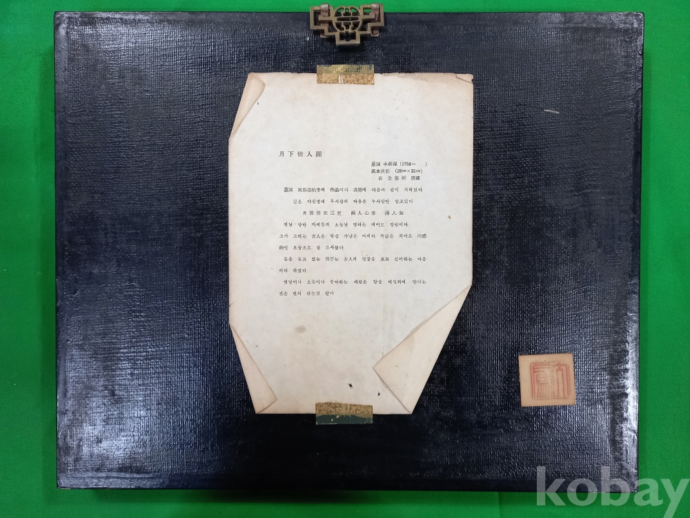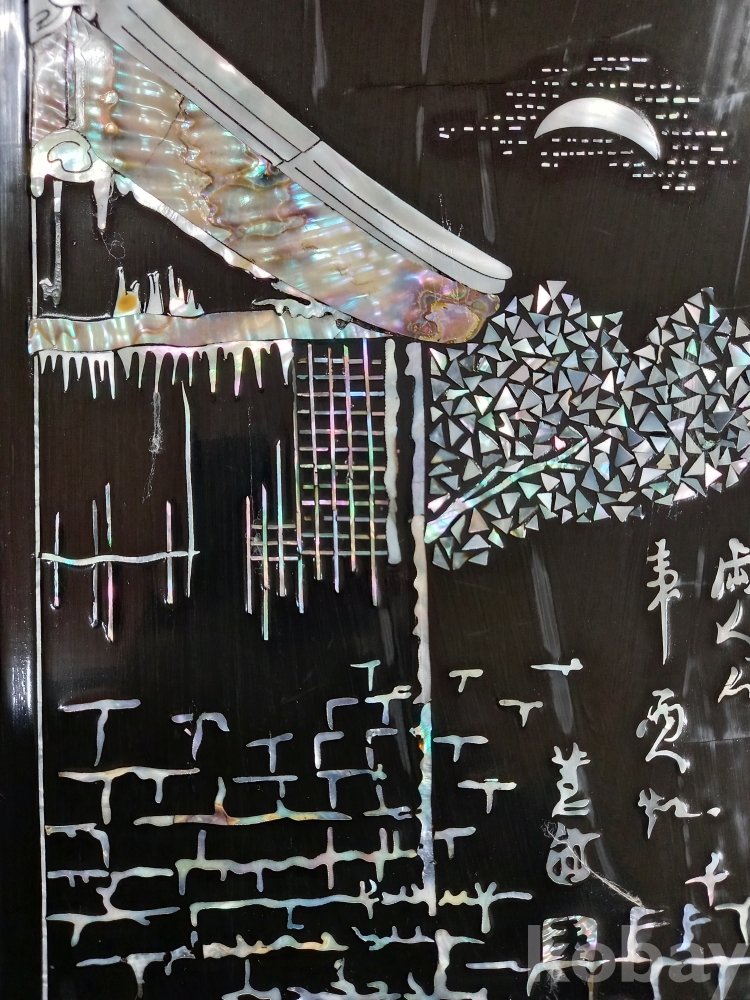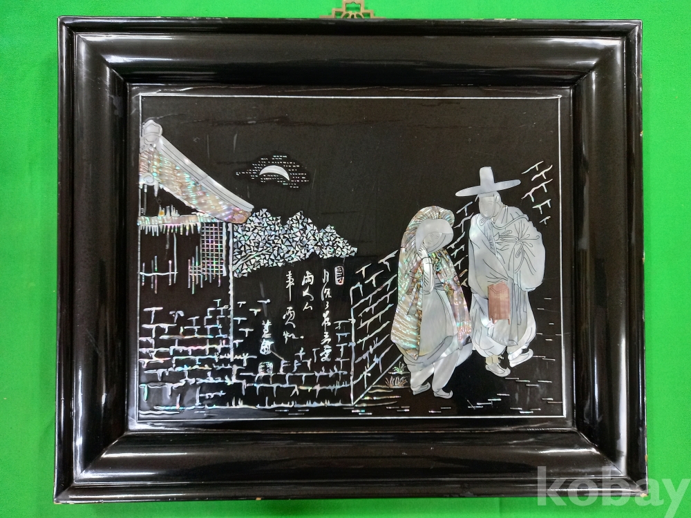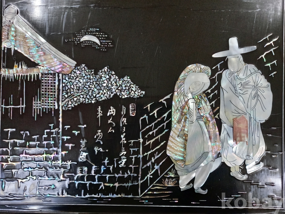 혜원 신윤복의 "월화정인"을 나전칠기(자개)로 묘사한 한국의 전통 공예 기법인 나전칠기로 제작된 예술 작품입니다.