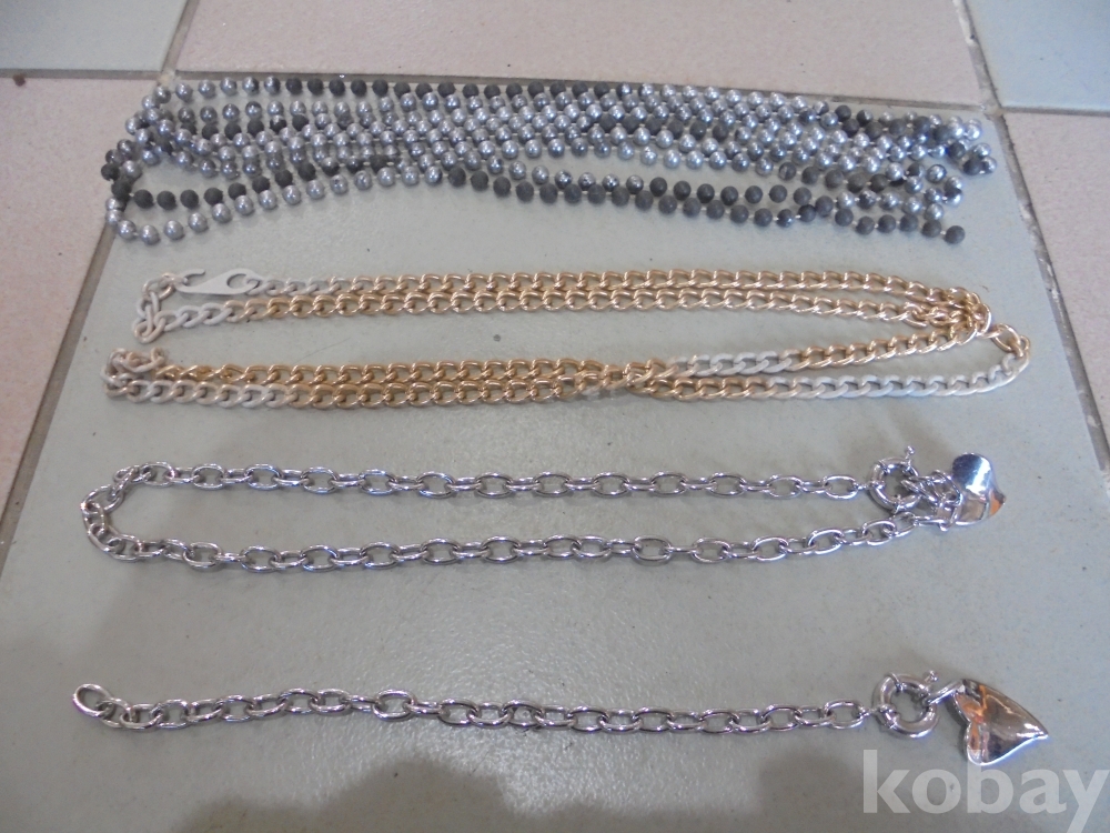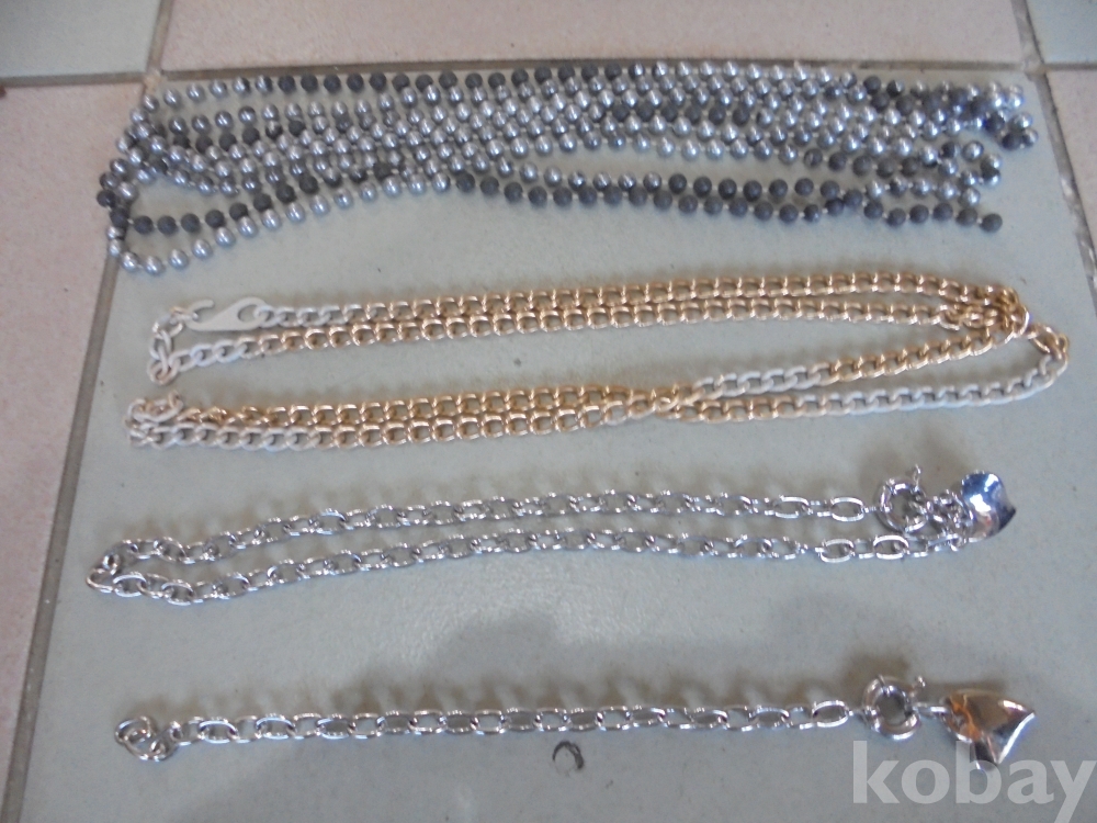사슬이 금색만칠한 긴다란사슬 1점 은색 검은색 구술이 아주긴것1점 고급 스텐루같은 사슬과 하트와 열고닫는 고리기구있는것 2점
