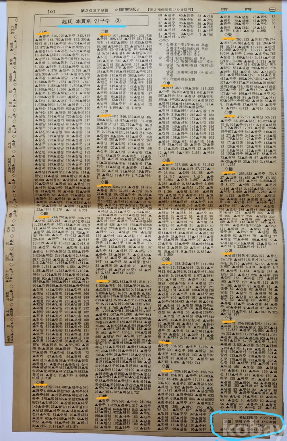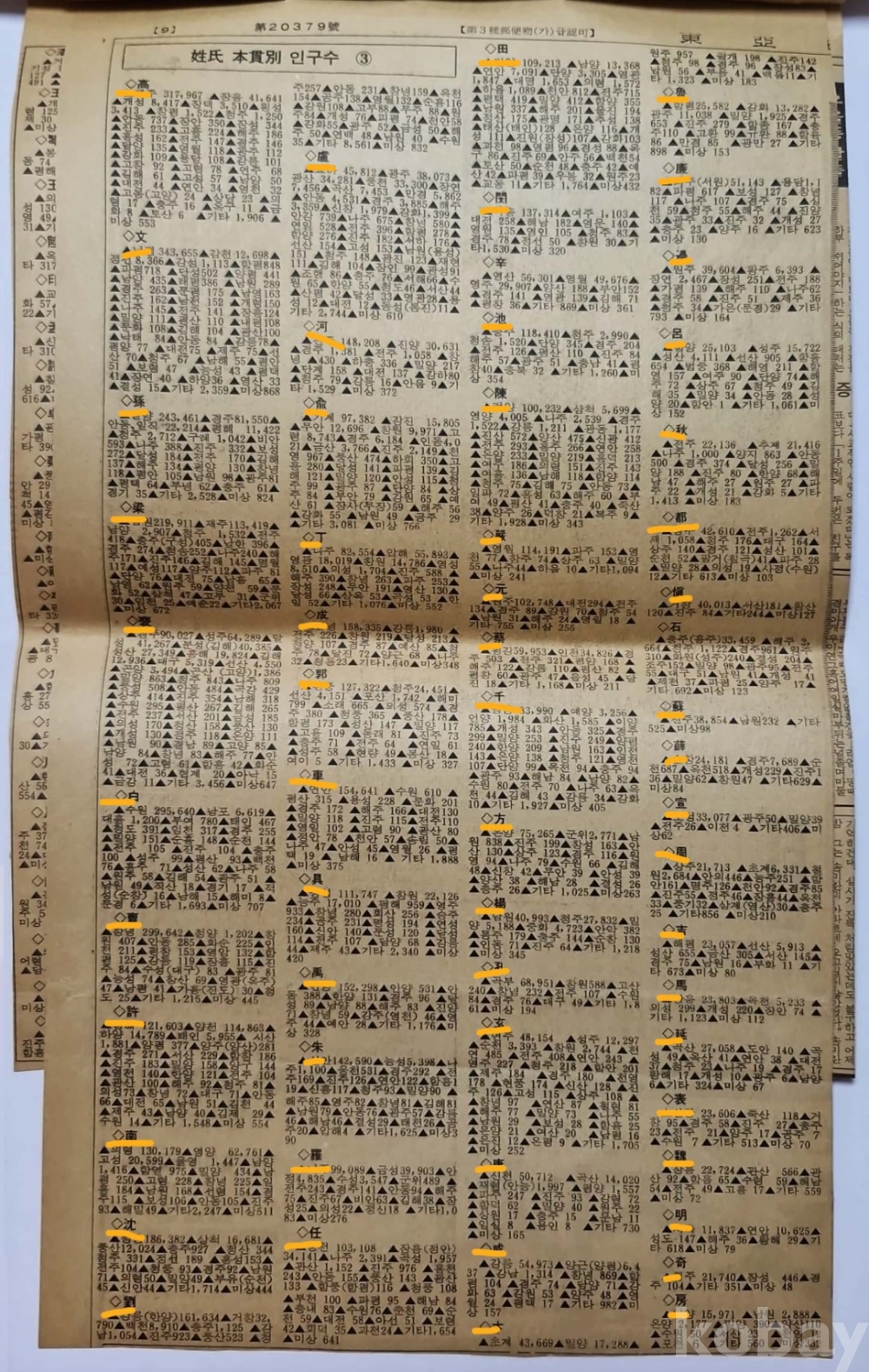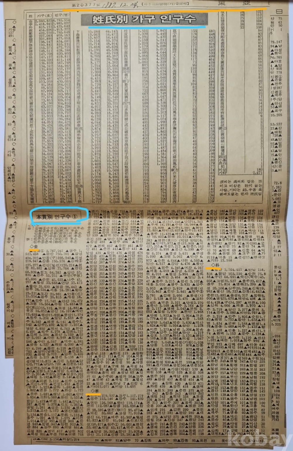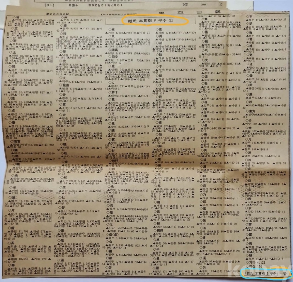 ◈ 1987년 12월 24일 동아일보에 게재된 성씨별(姓氏別) 가구 인구수