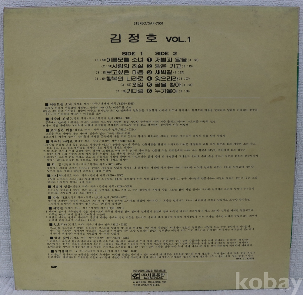 | 자켓상태 | EX : 약간의 마모, 모서리 찢김 존재 | 음반상태 | EX : 재생에 영향 없는 가벼운 기스 존재 | 발매정보 | 초반 | 가사지여부 | 유 |