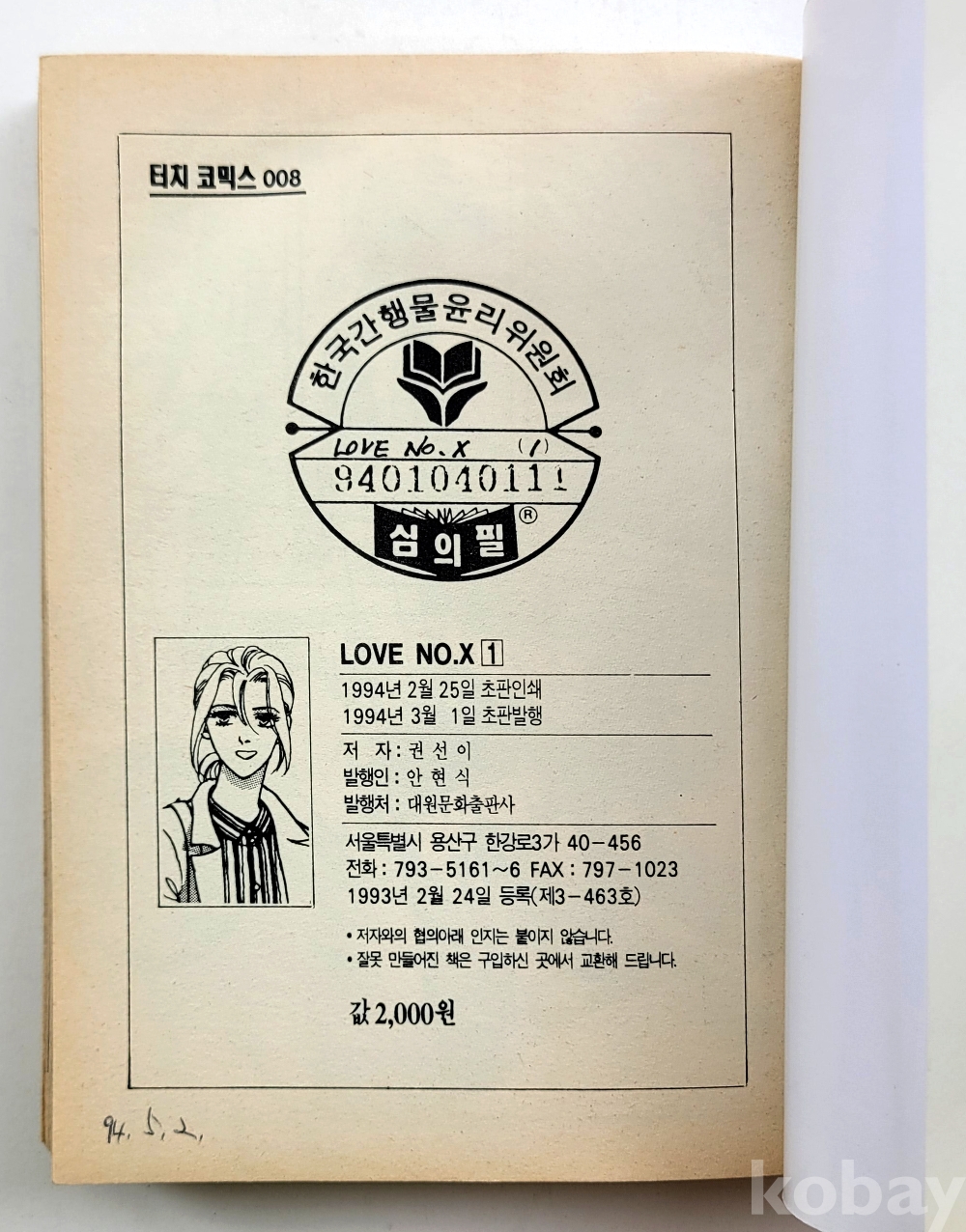 물 품 명 | 권선이 / LOVE No. X (1,2,3)완결 총3권 / 터치코믹스 / 1994년 초판 / 대원문화출판사 |