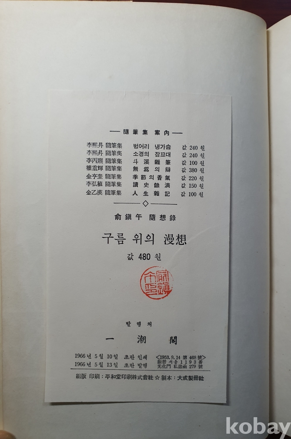 유진오 수필,일조각,1966년 초판,상태는 양호 깨끗한 책,하드커버