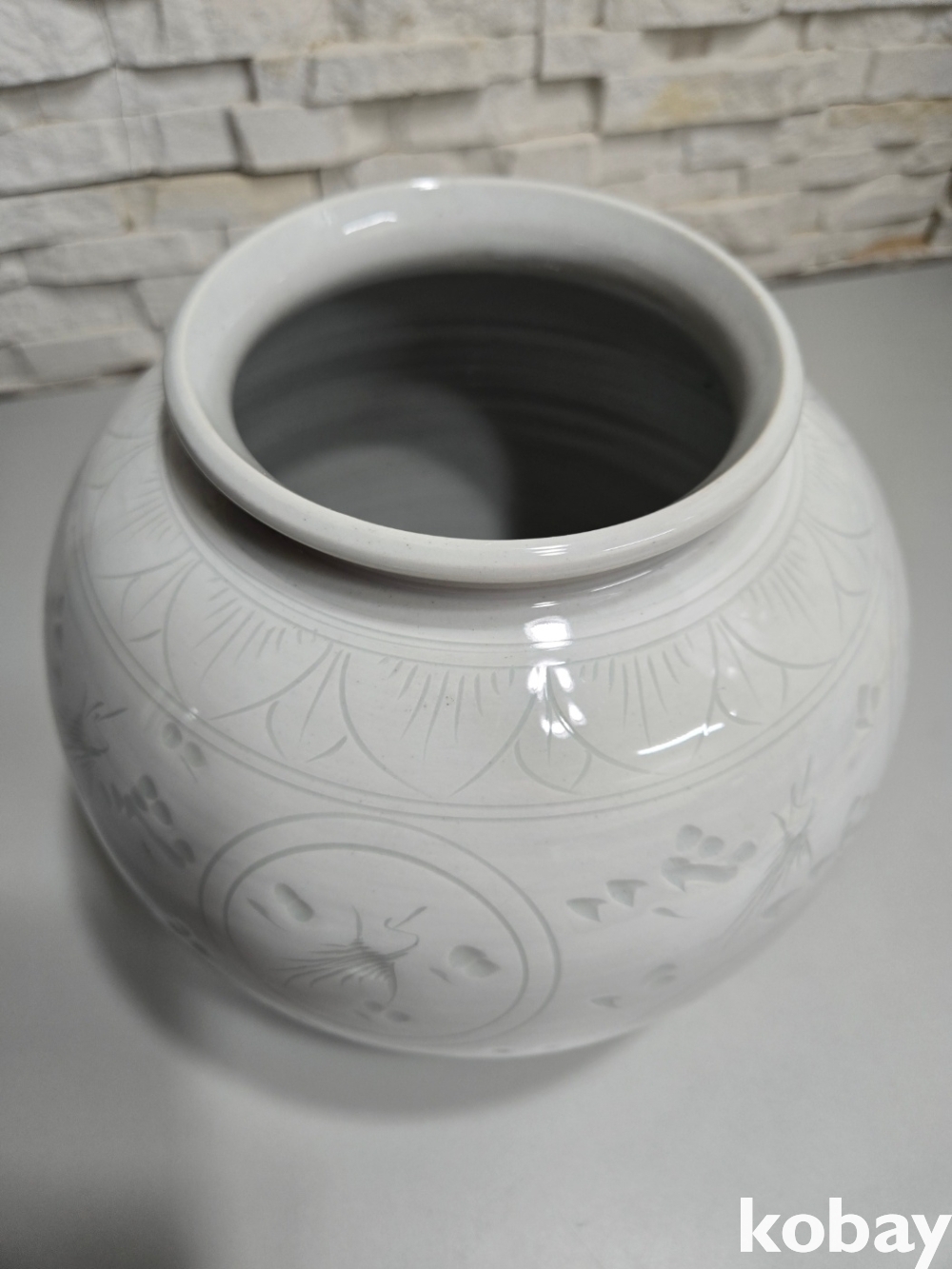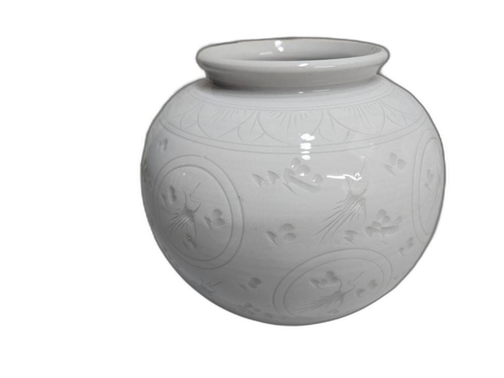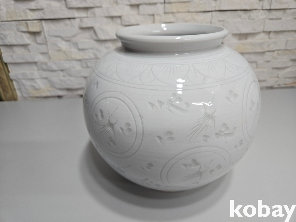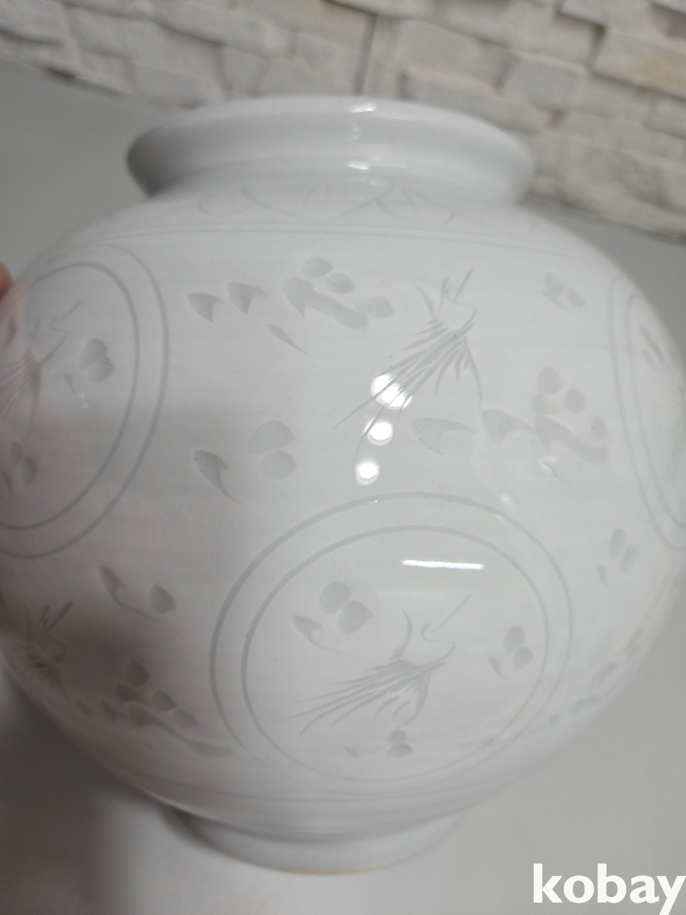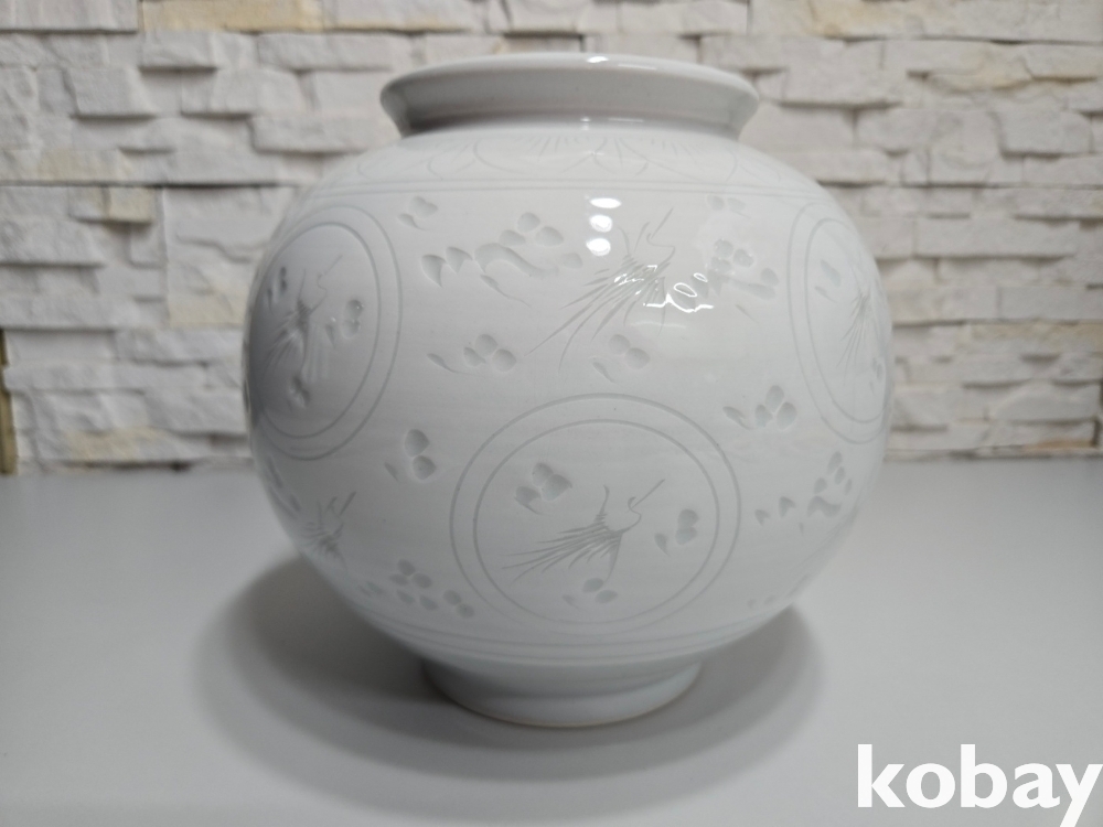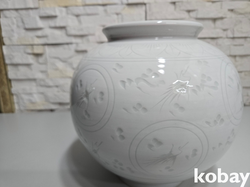 운학 문양이 음각으로 표현된 달 도자기 입니다.