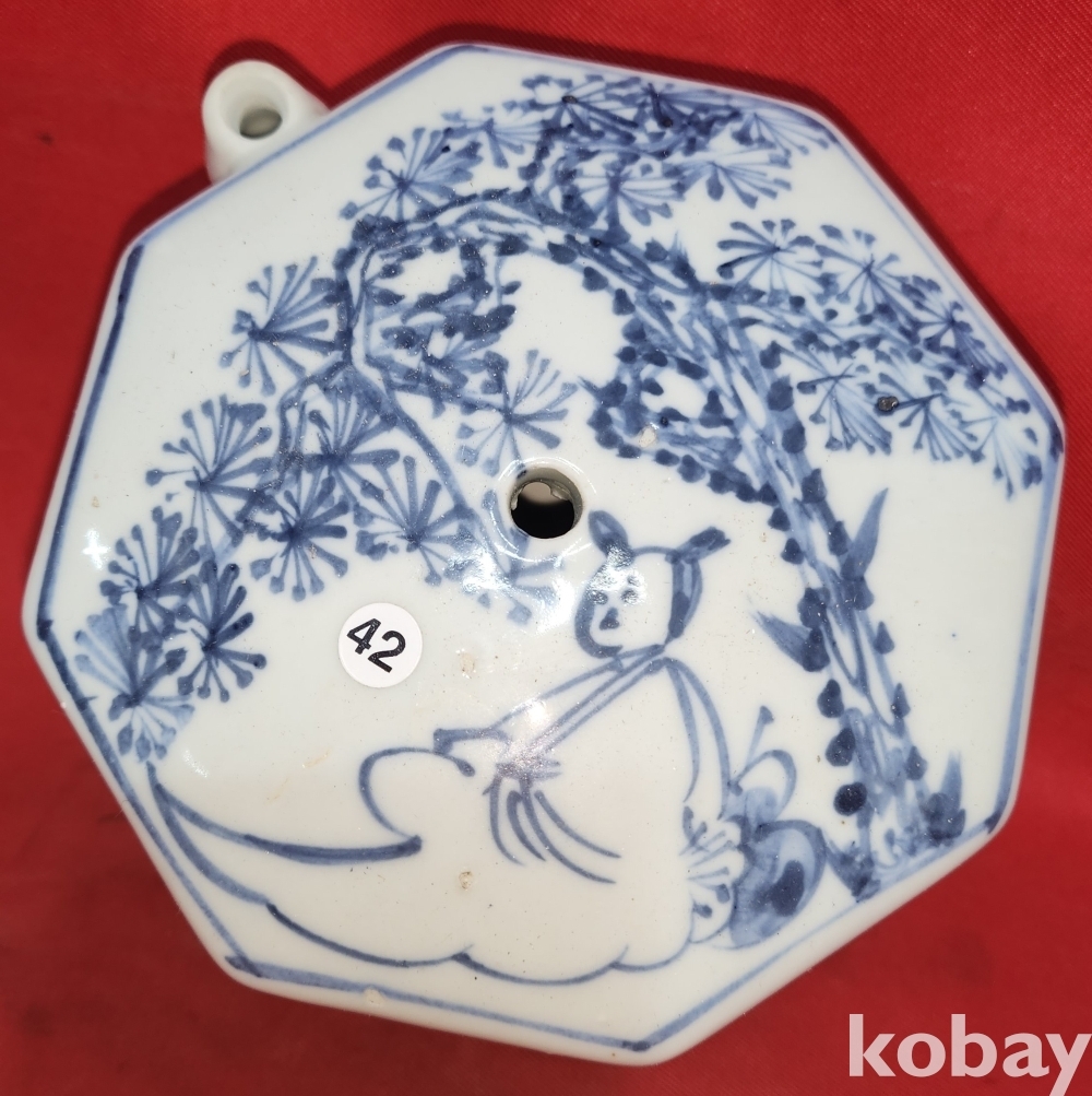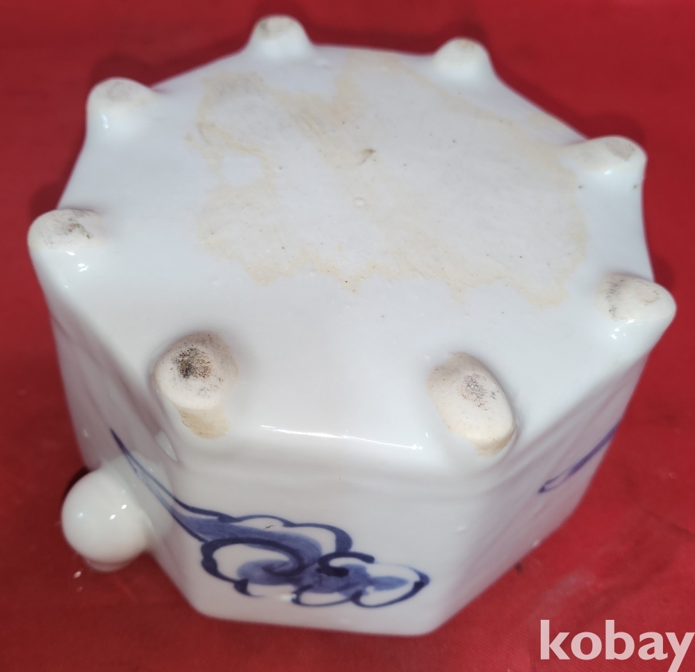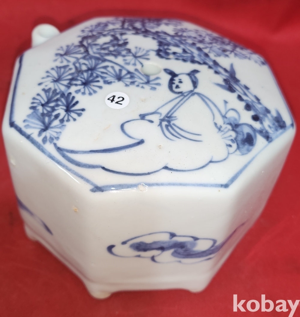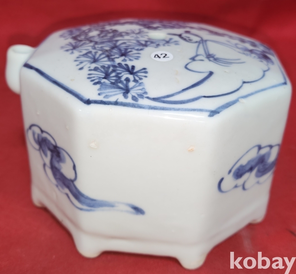 청화백자 송하인물도 문양 8각 연적입니다,
