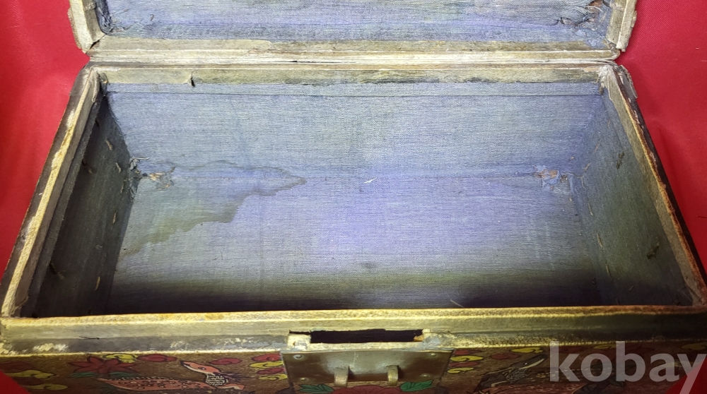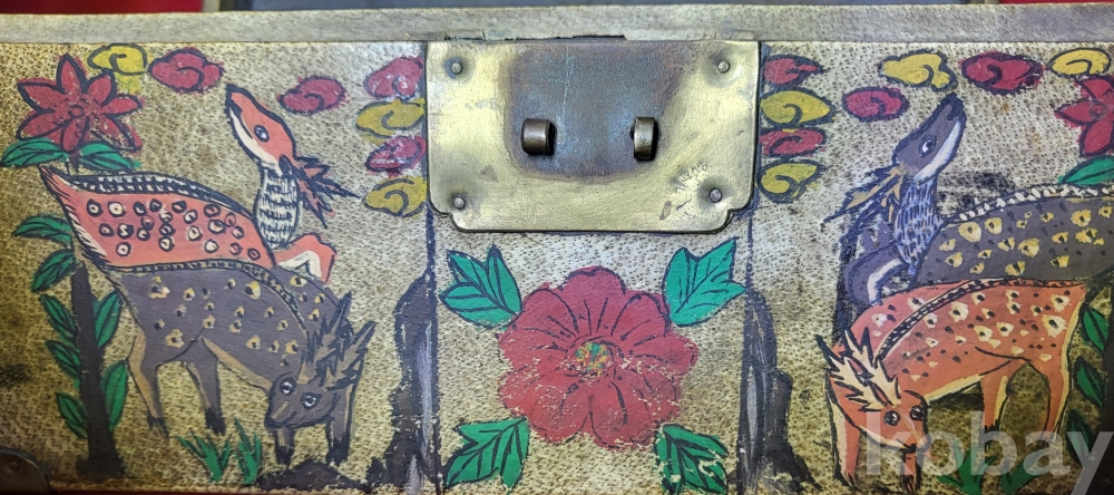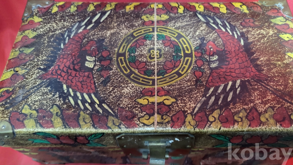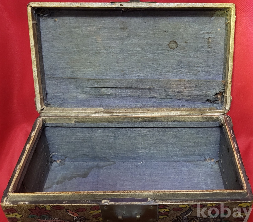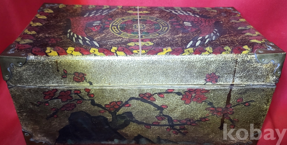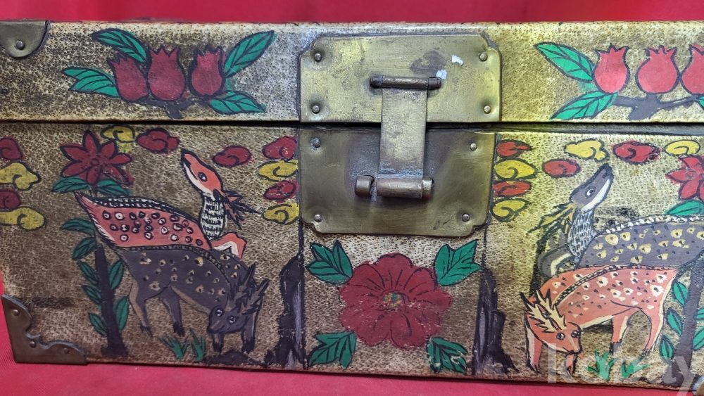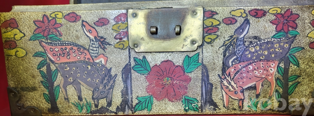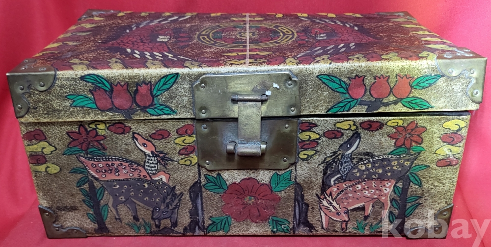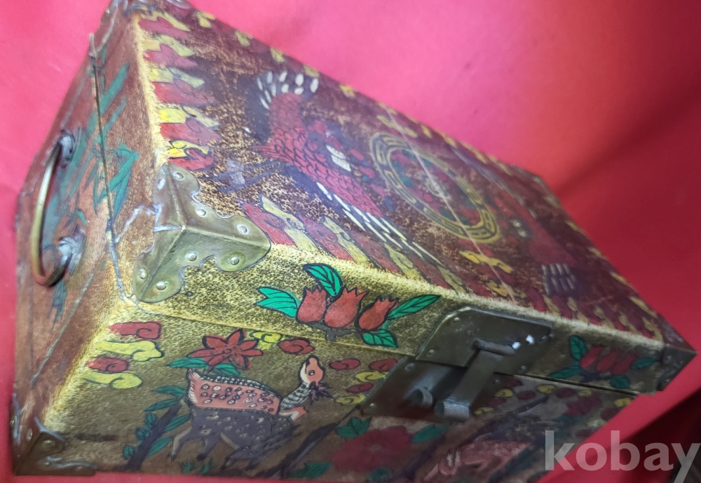 조선시대 가죽에 당채로 마감된 쌍봉황 사슴,대나무,괴석에 매화.석류,장생도 문양 함입니다,