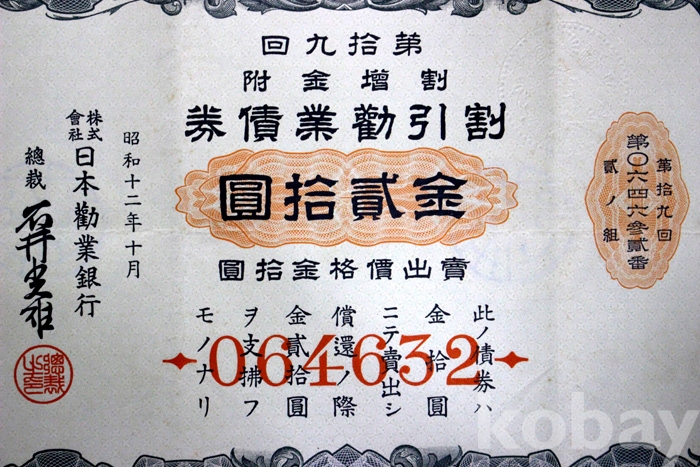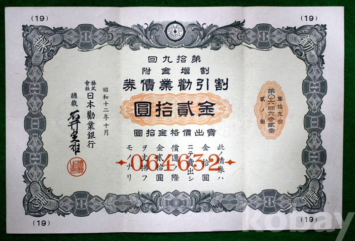 1937년 일본근업은행의 제19회 할증금부 할인근업채권 : 金 20원