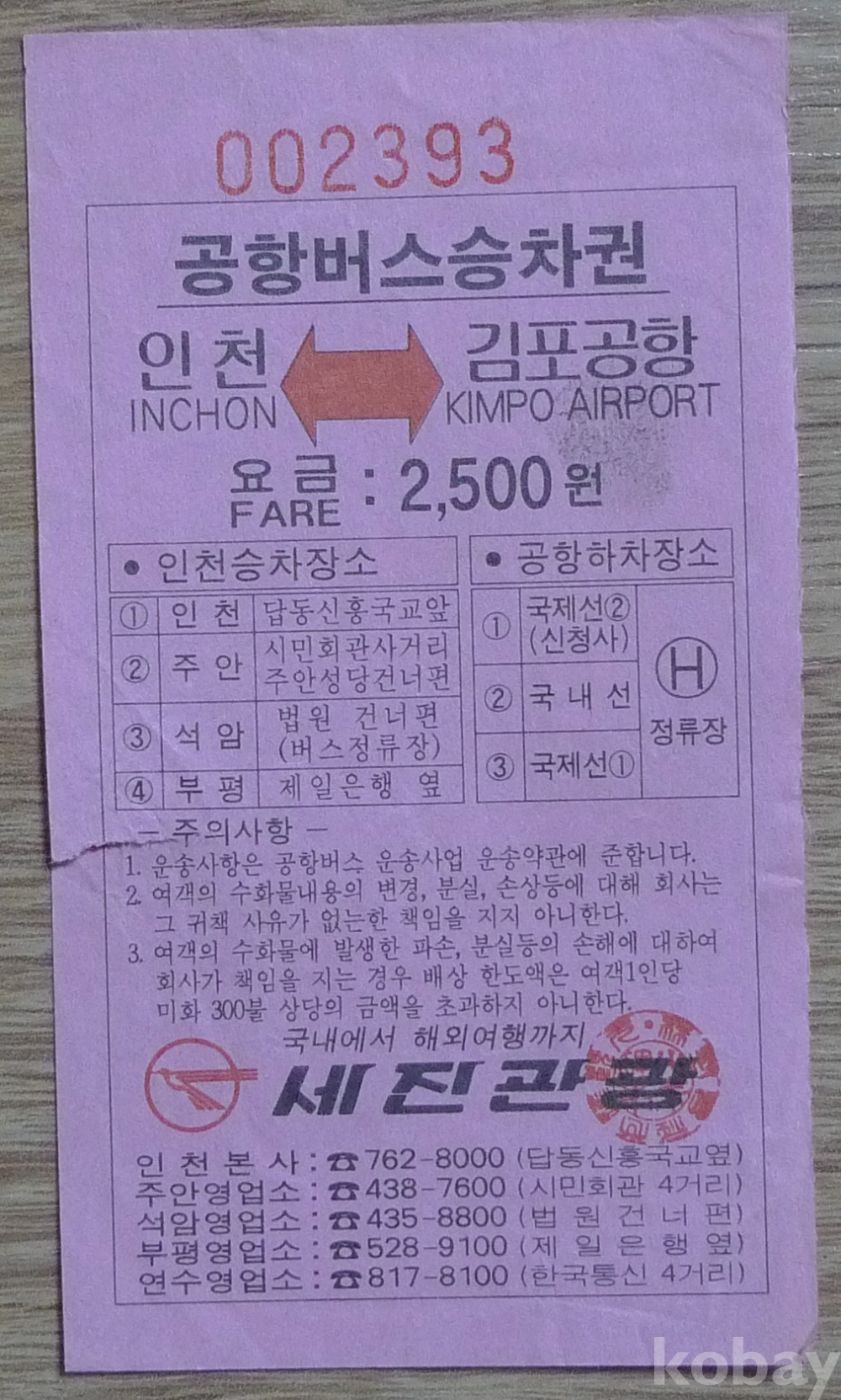 인천 - 김포공항 2500원 세진관광 공항버스 승차권