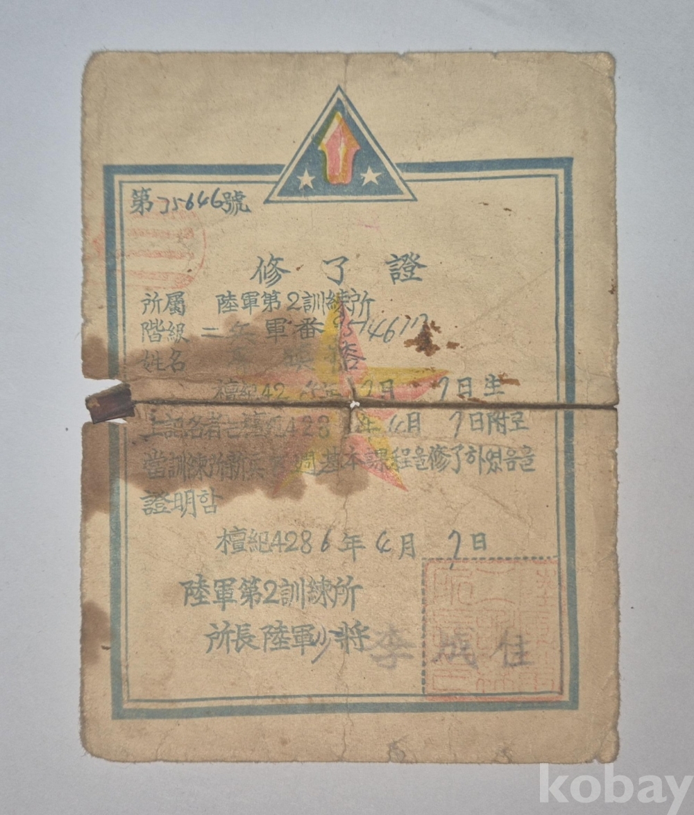 1953년 육군 제2훈련소에서 발행한 군사 교육 수료증입니다.
