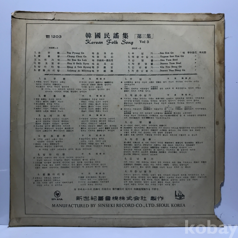 LP 83,840-56 한국민요 3 . 자켓 EX- 알판 VG+ 국내반