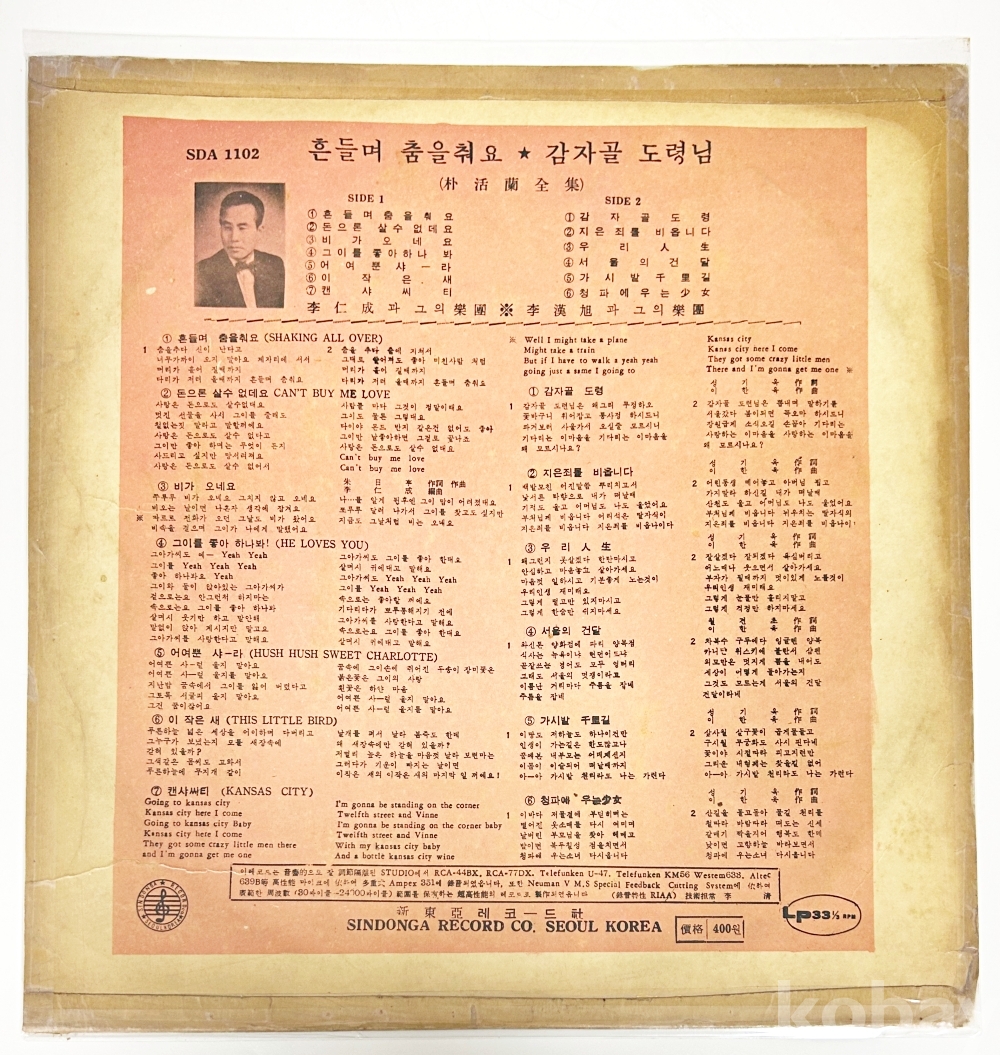 상품 설명 | Side A 1. 흔들며 춤을 춰요 2. 돈으로 살수 없데요 3. 비가 오네요 4. 그이를 좋아하나 봐 5. 아여뿐 샤-라 6. 이 작은새 7. 캔샤씨티 Side B 1. 감자골 도령 2. 지은 죄를 비옵니다 3. 우리 인생 4. 서울의 건달 5. 가시밭 천리길 6. 청파에 우는 소녀 | ||