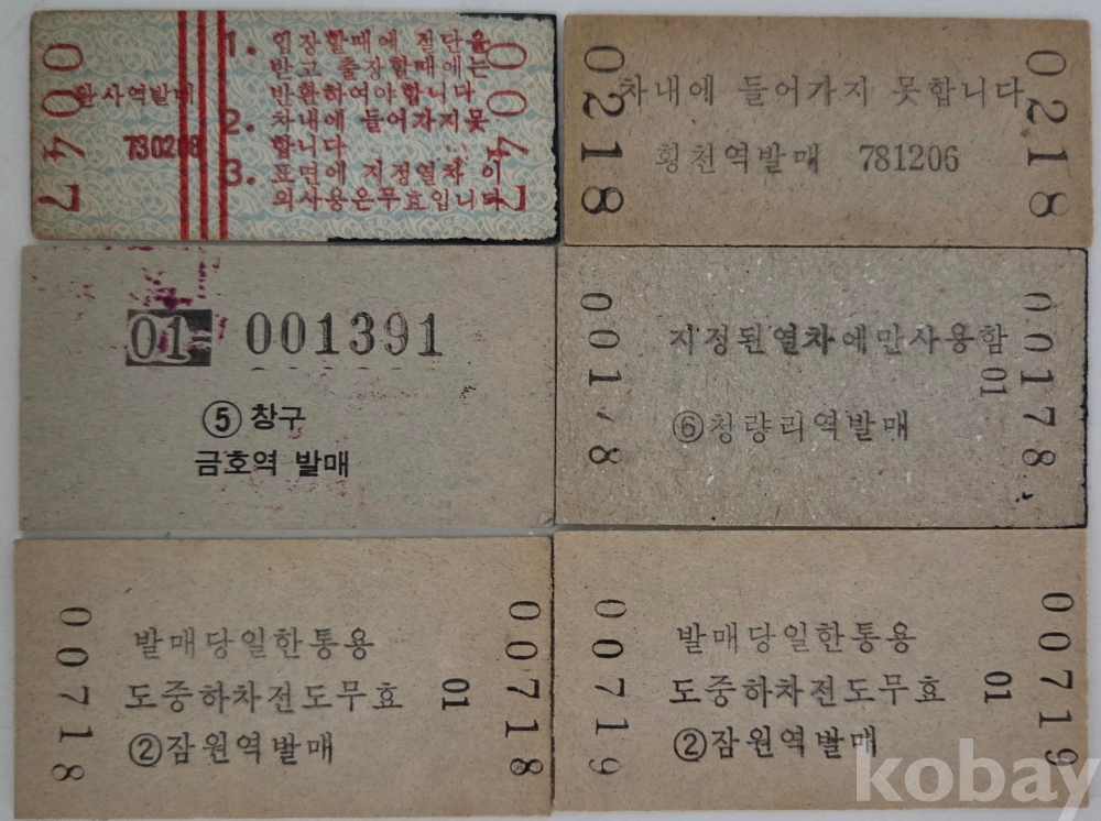 철도역 횡천역, 완사역 입장권, 지하철 서울대 > 부천, 잠원역 보충권, 새마을호 에드몬슨 입니다.